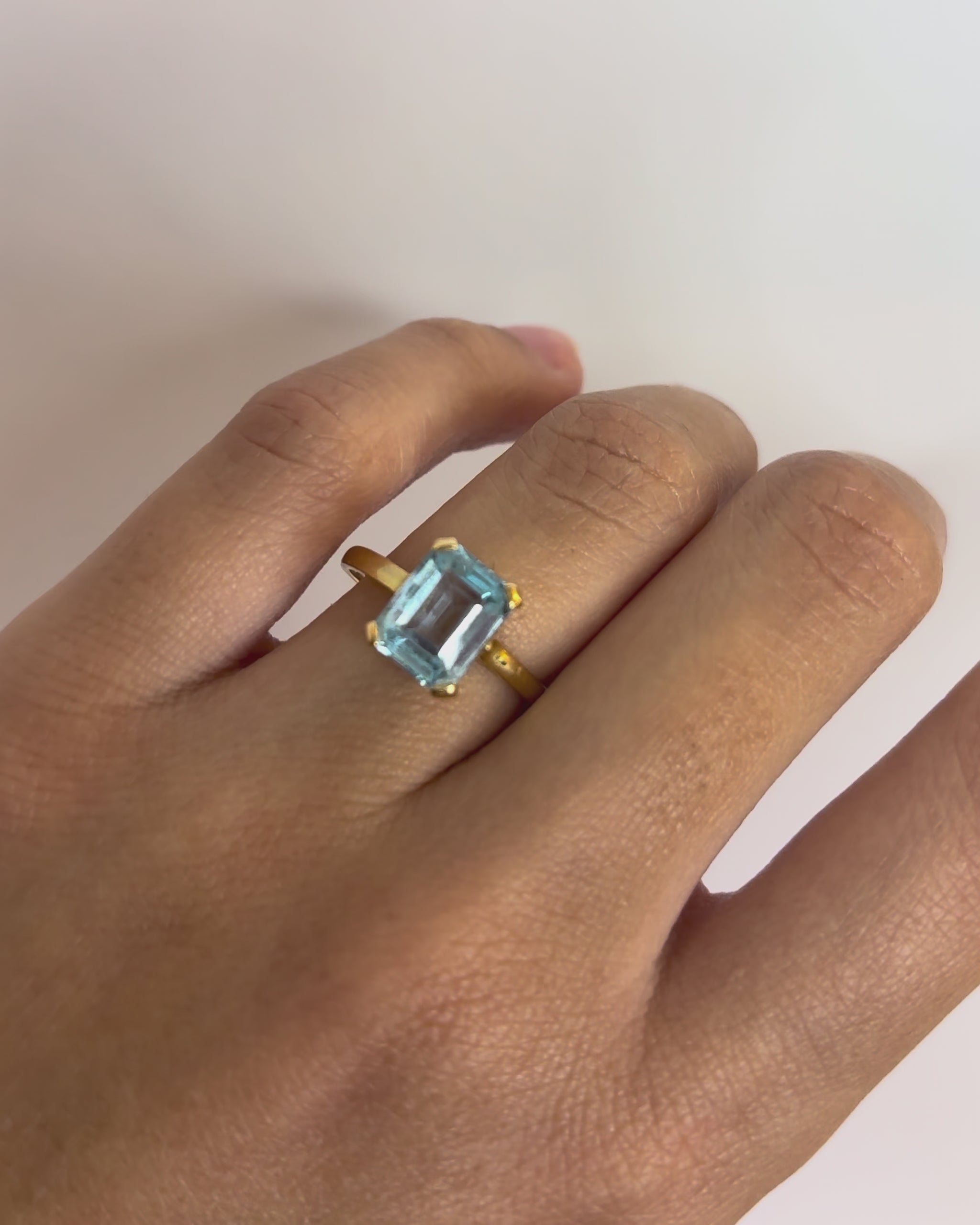 "Ciella" est une sublime bague cocktail vintage, finement façonnée par un véritable maître joaillier en or gris 18 carats. Elle est sertie en son cœur d'une majestueuse topaze de 3.46 carats, d'un magnifique bleu ciel lumineux et vibrant.