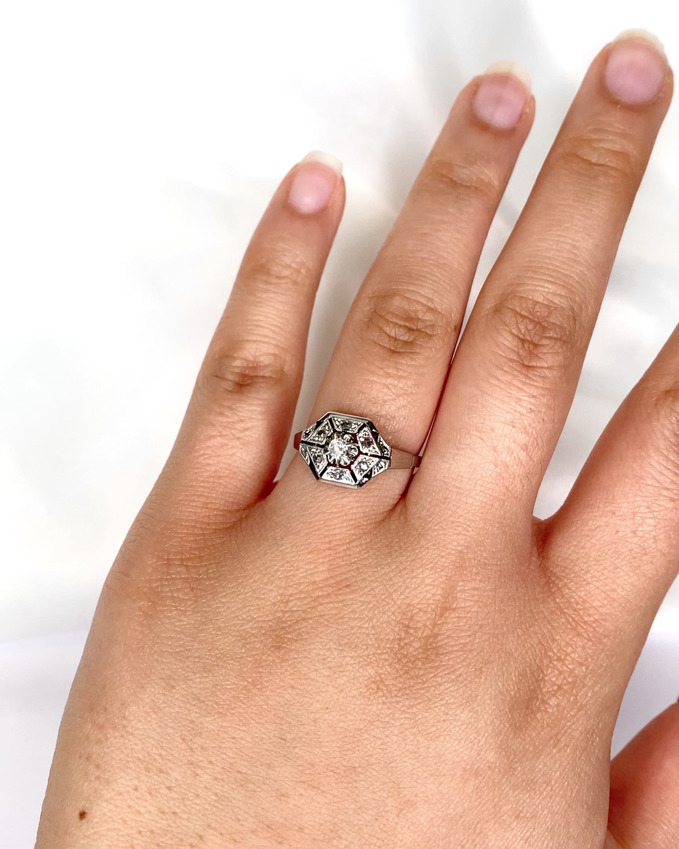 "Valeria" est une magnifique bague art déco datant des années 1930, une création unique façonnée par un joaillier français en or gris 18 carats et platine. Son magnifique motif géométrique, délicatement ciselé et ajouré, incarne avec finesse l’audace et la modernité de l’époque. Il est serti d'un diamant central de 0.07 carat et 6 diamants taille rose totalisant 0.03 carat, qui lui confèrent un éclat irrésistible.