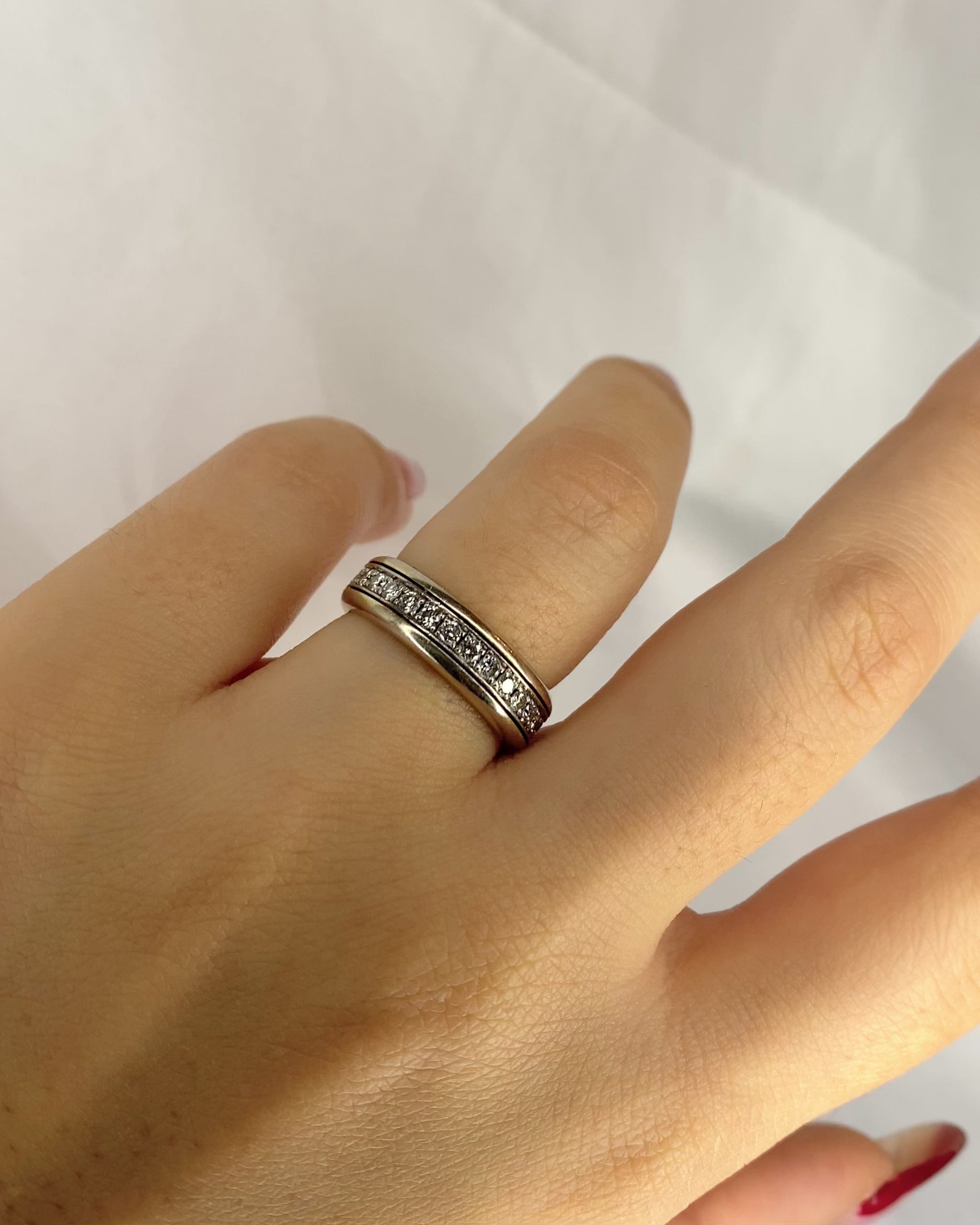 La bague "Tessa" est une alliance américaine vintage, finement façonnée en or gris 18 carats. Elle est sertie de 28 diamants totalisant 0.56 carat, qui lui confèrent un éclat unique. Cette bague de caractère puise son inspiration de l'iconique bague "Possession" de Piaget, et incarne la tradition joaillière avec élégance et raffinement.