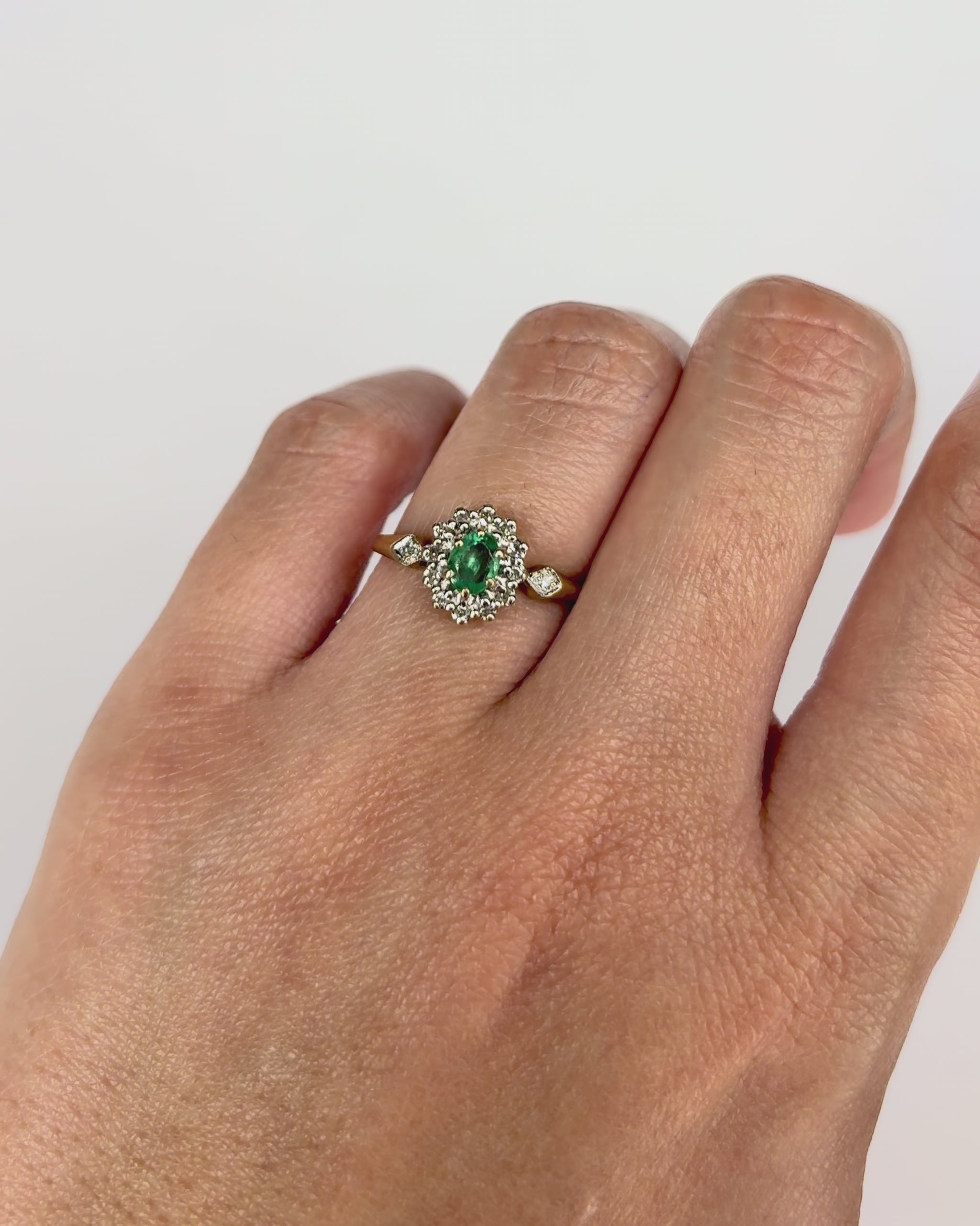 "Tonia" est une sublime bague marguerite vintage, façonnée en or jaune et gris 9 carats. Elle présente au cœur de son élégant motif floral une délicate émeraude de 0.26 carat, épaulée d'un très beau travail de l'or gris et d'un scintillant pavage composé de 14 diamants totalisant 0.14 carat.