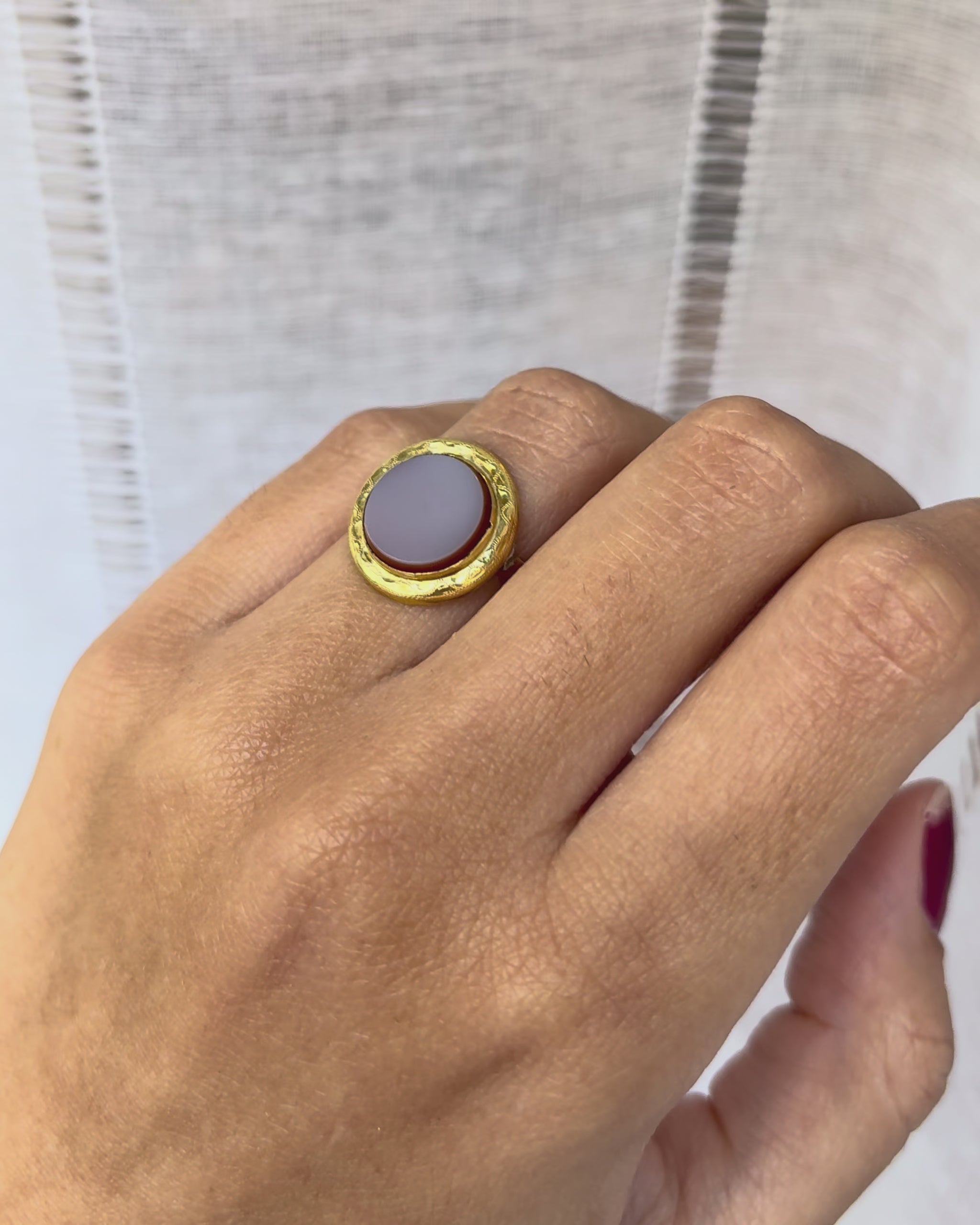 "Sophie" est une magnifique bague vintage, finement façonnée en or jaune 18 carats, au début du XXème siècle. En son cœur est sertie une belle et majestueuse cornaline. Tout son charme réside dans le raffinement du motif central, délicatement travaillé, qui confère à la pièce un caractère singulier.