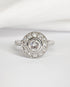"Molly" est une sublime bague Art déco vintage, façonnée par un maître joaillier français en or gris 18 carats et platine, dans les années 1930. Son magnifique motif géométrique incarne avec finesse l’audace et la modernité de l’époque. Il est serti d'un diamant central taille brillant de 0.80 carat, épaulé d'un halo de 12 diamants taille ancienne de 0.48 carat au total.