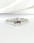 "Rahma" est une sublime bague solitaire, finement façonnée en or gris 18 carats. Elle présente en son cœur 5 diamants taille baguette, d'une très belle qualité. Ils sont rehaussés par un pavage de 22 diamants taille rond brillant. L'ensemble des diamants totalise 0.39 carat, et offre à ce solitaire un éclat remarquable, résolument chic.