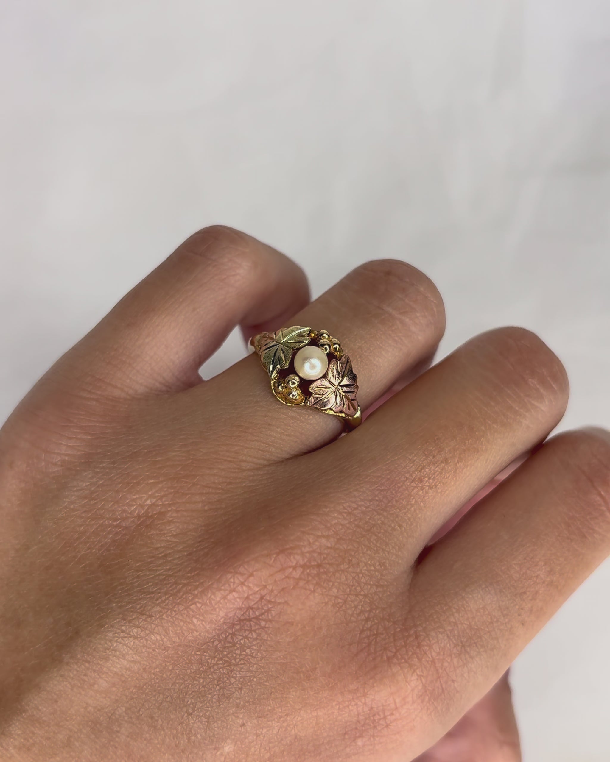 "Salomé" est une sublime bague de la fin du XIXème siècle, très délicatement façonnée en or jaune et rose 18 carats. Au cœur d'un magnifique travail feuillagé alliant deux ors, fruit d'un savoir-faire de précision, est sertie une belle et lumineuse perle. Elle apporte raffinement et élégance à cette bague ancienne de caractère.