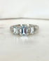 "Axelle" est une magnifique bague trilogie vintage, façonnée dans les années 1980 en or gris 9 carats. Elle est sertie en son cœur de trois belles Aigues-Marines taille émeraude totalisant 1.40 carat, au bleu doux et profond. Elles sont épaulées d'un élégant travail diamanté, soit 12 diamants totalisant 0.06 carat, qui leur confèrent un sublime éclat.