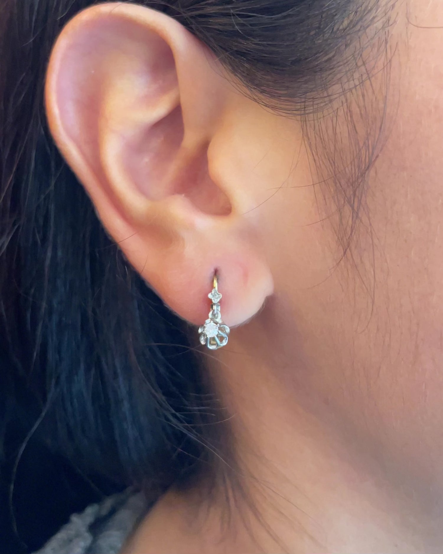 Ces dormeuses incarnent la grâce discrète des bijoux anciens, parfaites pour illuminer le visage avec légèreté. L’association précieuse de l’or jaune et du platine leur confère une allure raffinée, tandis que le poinçon tête d’aigle garantit la qualité de l’or.