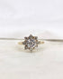 "Noha" est une délicate bague marguerite vintage, façonnée en or jaune et gris 18 carats. Elle met en lumière un diamant central de 0.10 carat, sublimé par un éclatant entourage de 8 diamants totalisant 0.08 carat.