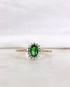 "Auxane" est une bague marguerite façonnée en or jaune 9 carats et or gris 9 carats,  confectionnée par un maître joaillier. Laissez-vous séduire par son sublime grenat tsavorite de 0.6 carat, une pierre de protection au vert lumineux et intense. Elle est entourée d'un flamboyant halo de 16 diamants de 0.8 carat au total.
