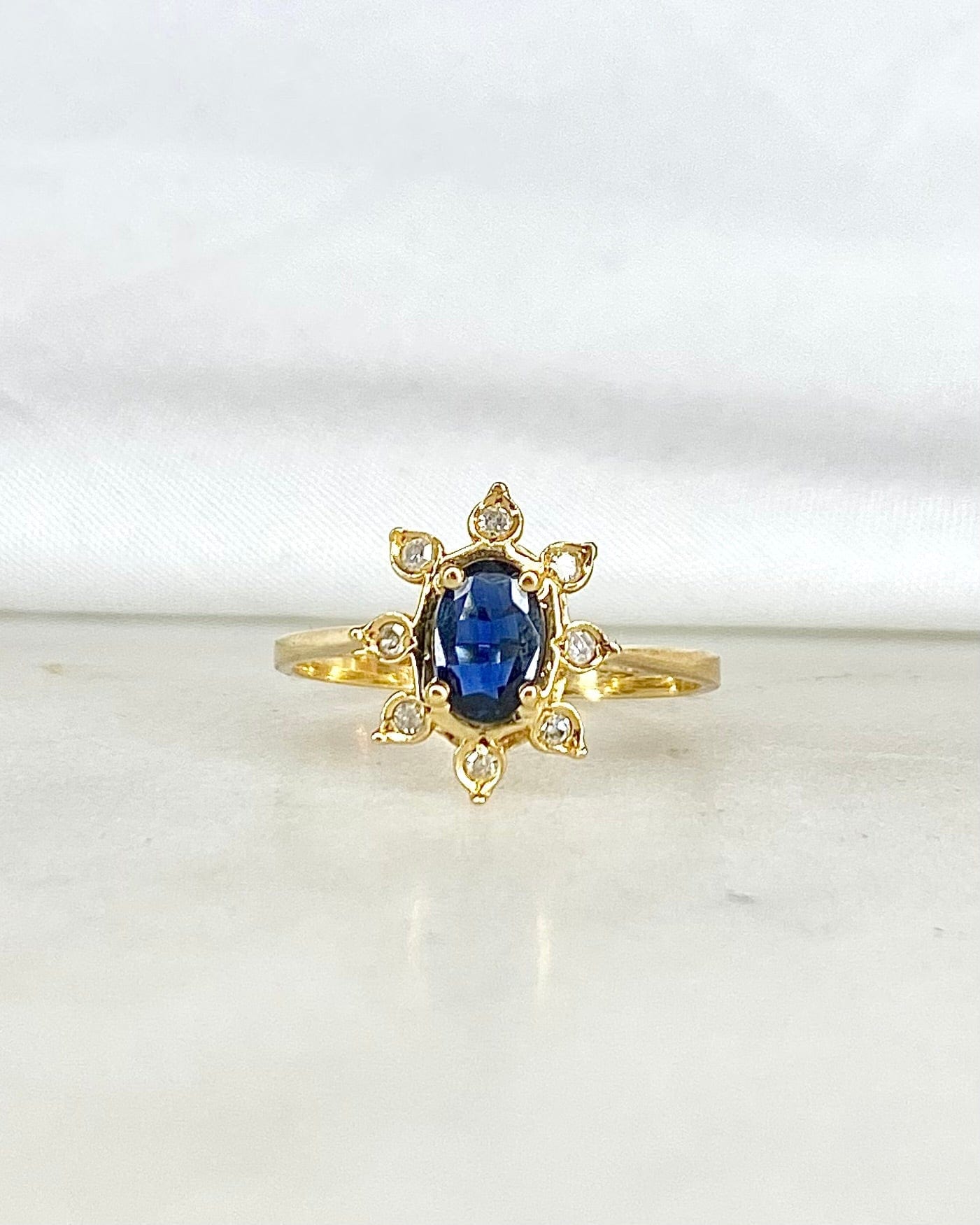 "Virginie" est une bague marguerite vintage, façonnée en or jaune 18 carats. Elle dévoile un magnifique saphir central de 0.45 carat, une pierre précieuse au bleu intense et profond. Il est sublimé par un halo de 8 diamants de 0.08 carat au total. Ils sont sertis sur un entourage de forme florale au design particulièrement délicat, reflet d'un savoir-faire joaillier français d'exception.