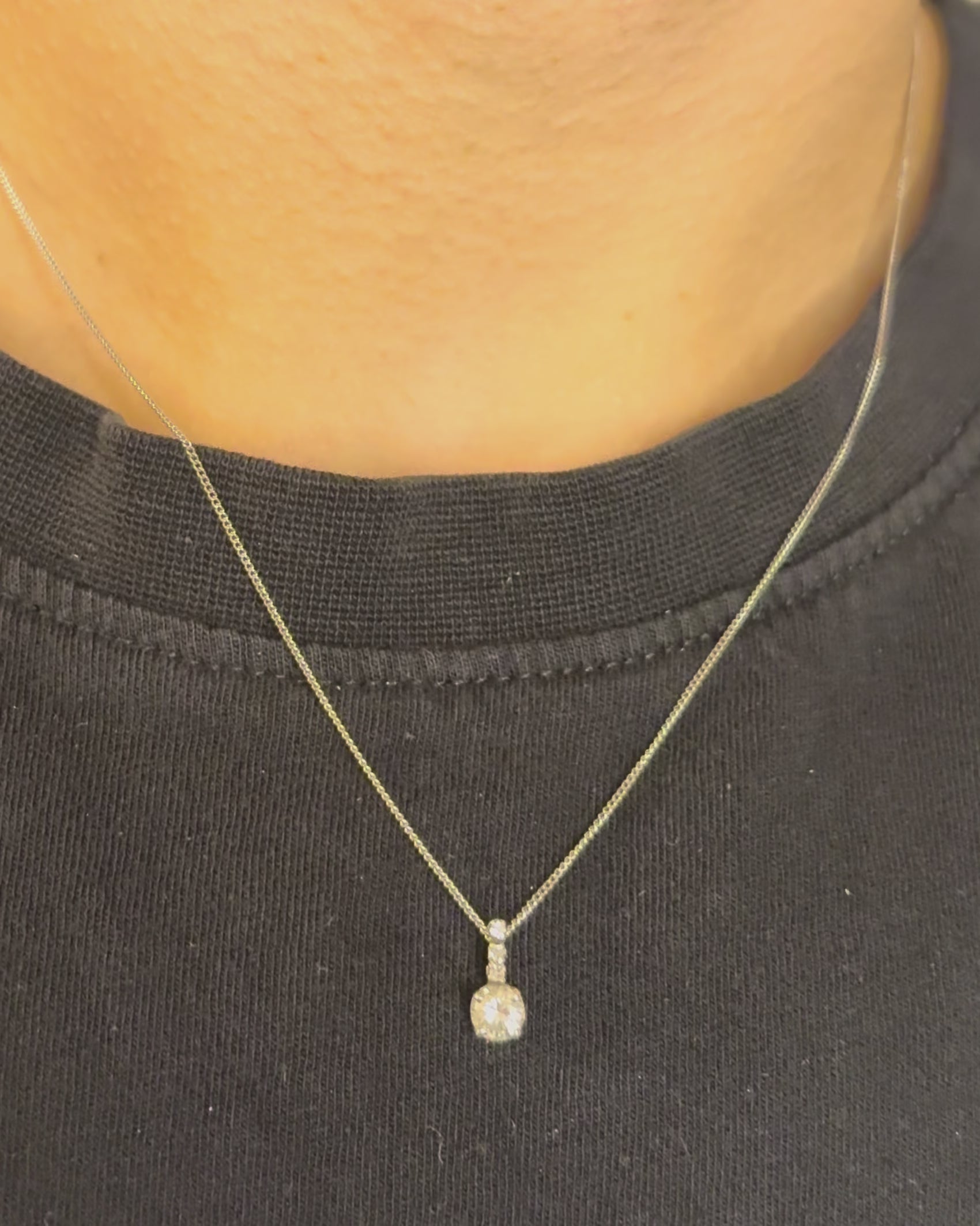 "Victoire" est un élégant pendentif vintage, façonné en or gris 18 carats dans les années 1950. En son cœur trône un sublime diamant de 0.45 carat. Il est épaulé d'un délicat travail diamanté au niveau de la bélière, composé de 3 diamants totalisant 0.06 carat. Ce bijou précieux et intemporel possède un éclat irrésistible.