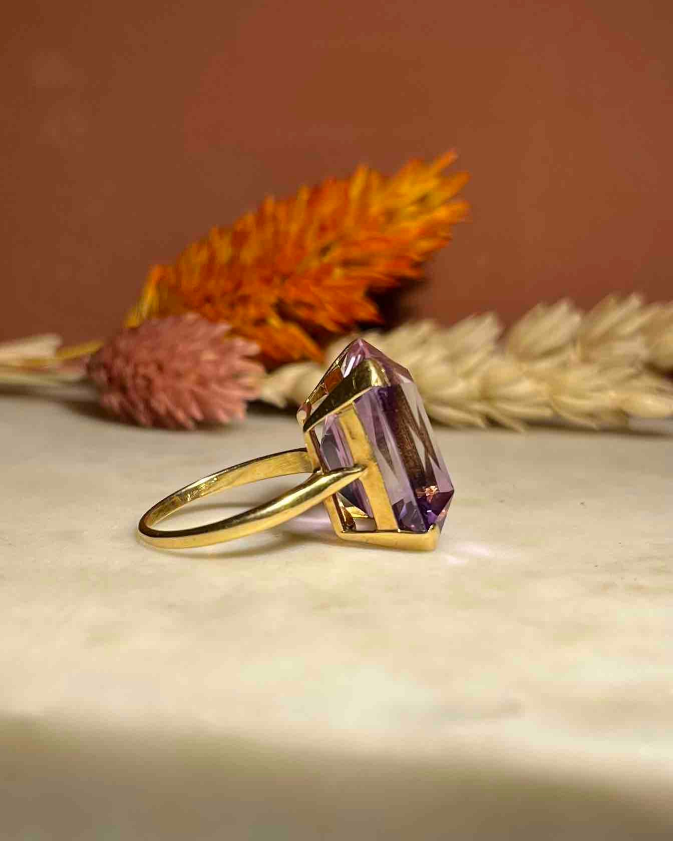En son centre est sertie une majestueuse améthyste lumineuse de 12 carats.