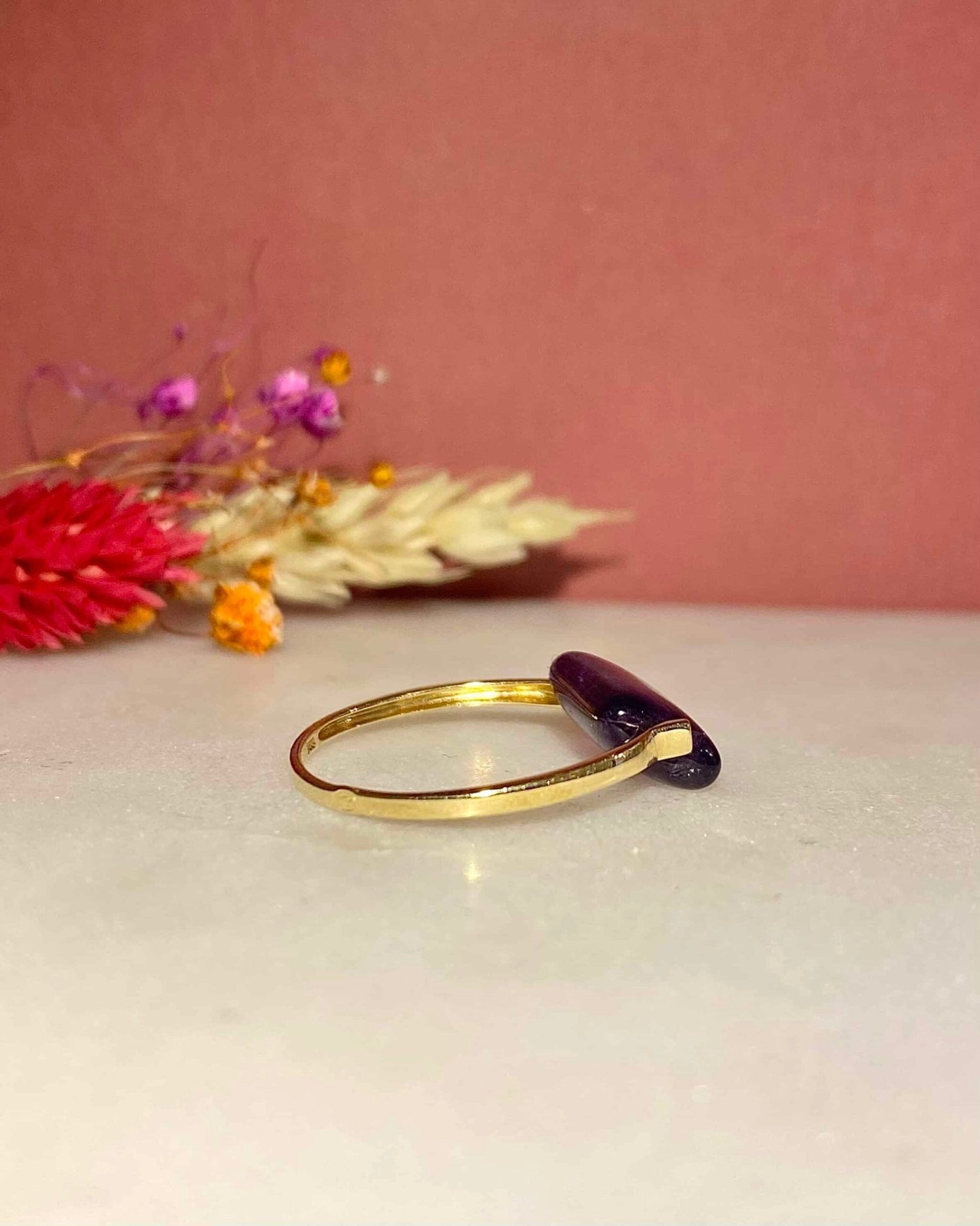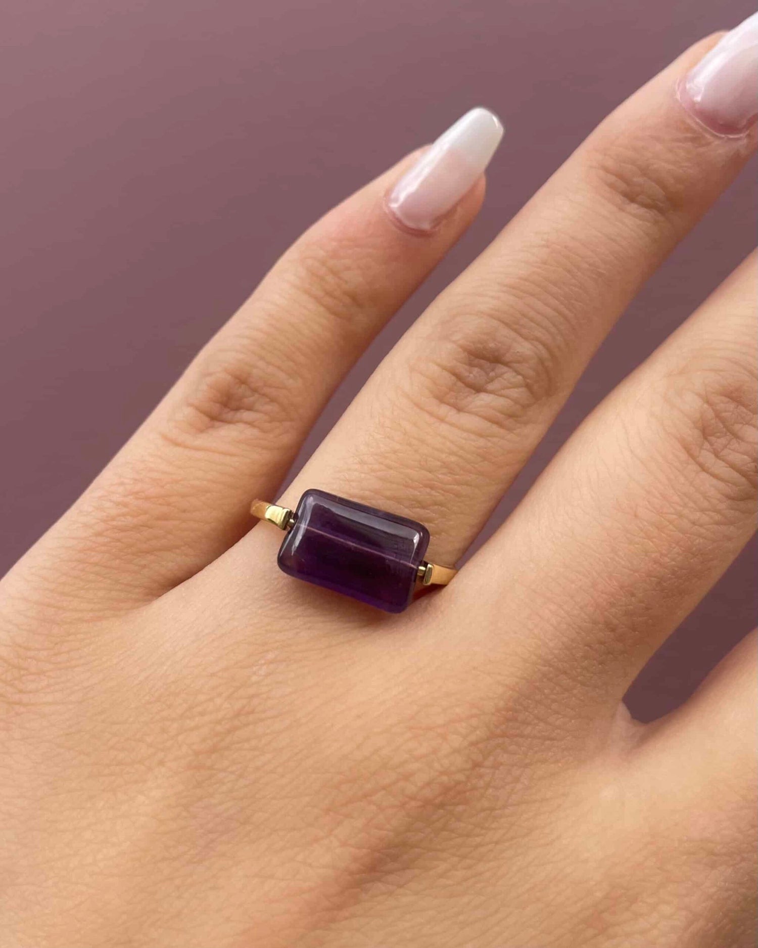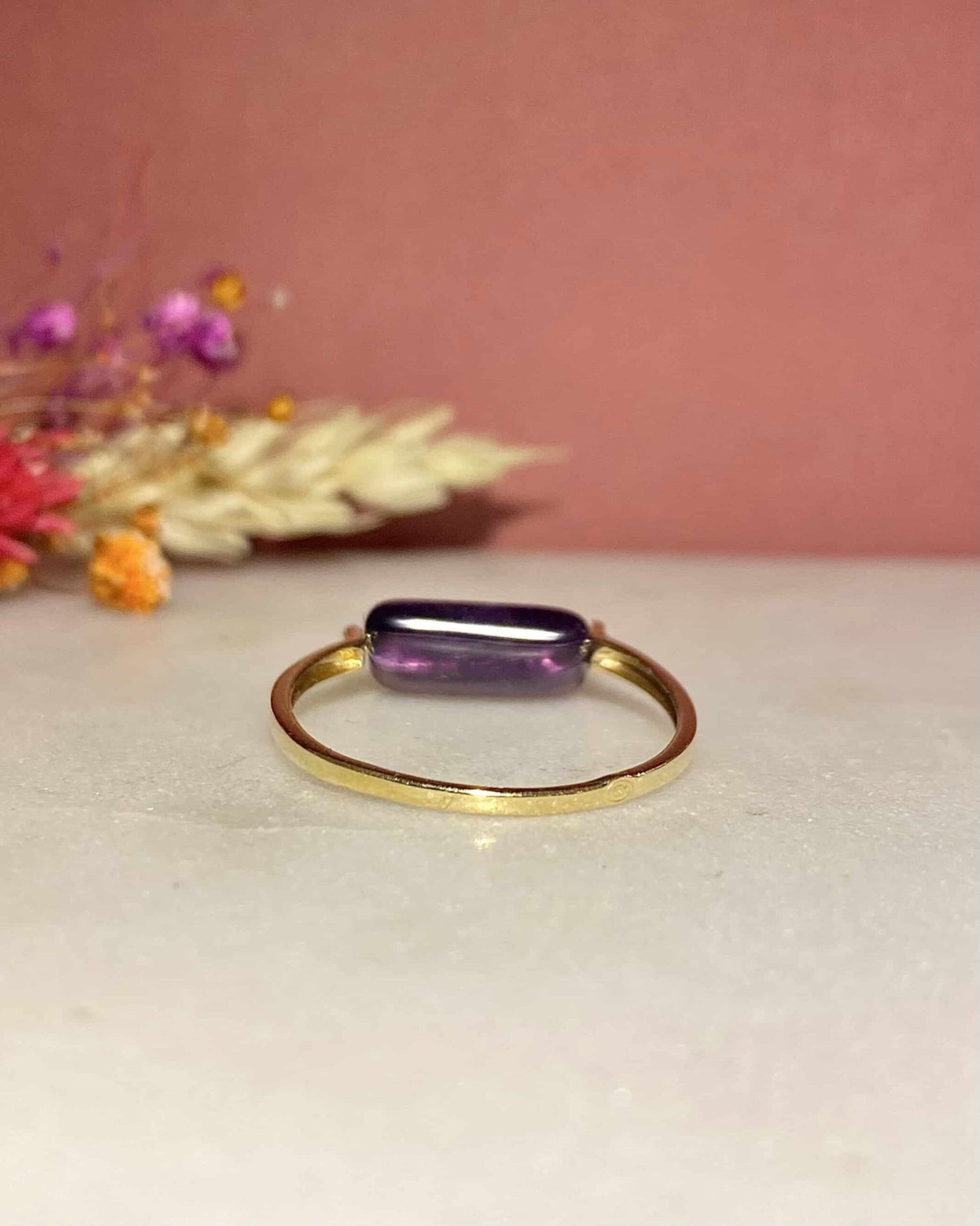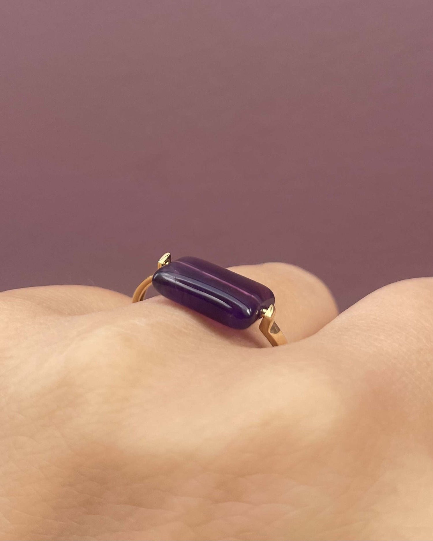 Au centre trône une somptueuse Améthyste mouvante de forme rectangulaire de 3.30 carats montée sur un anneau façonné à la main en or jaune 18 carats.