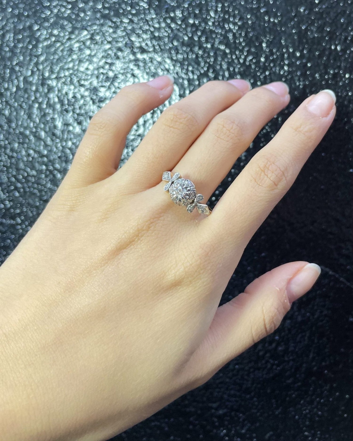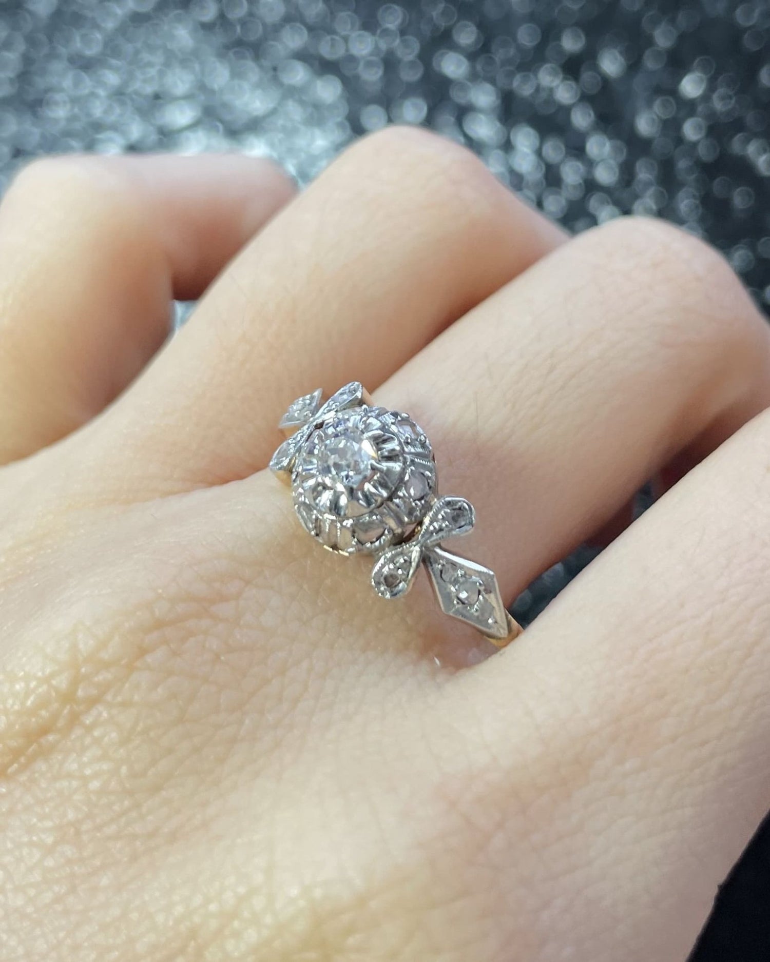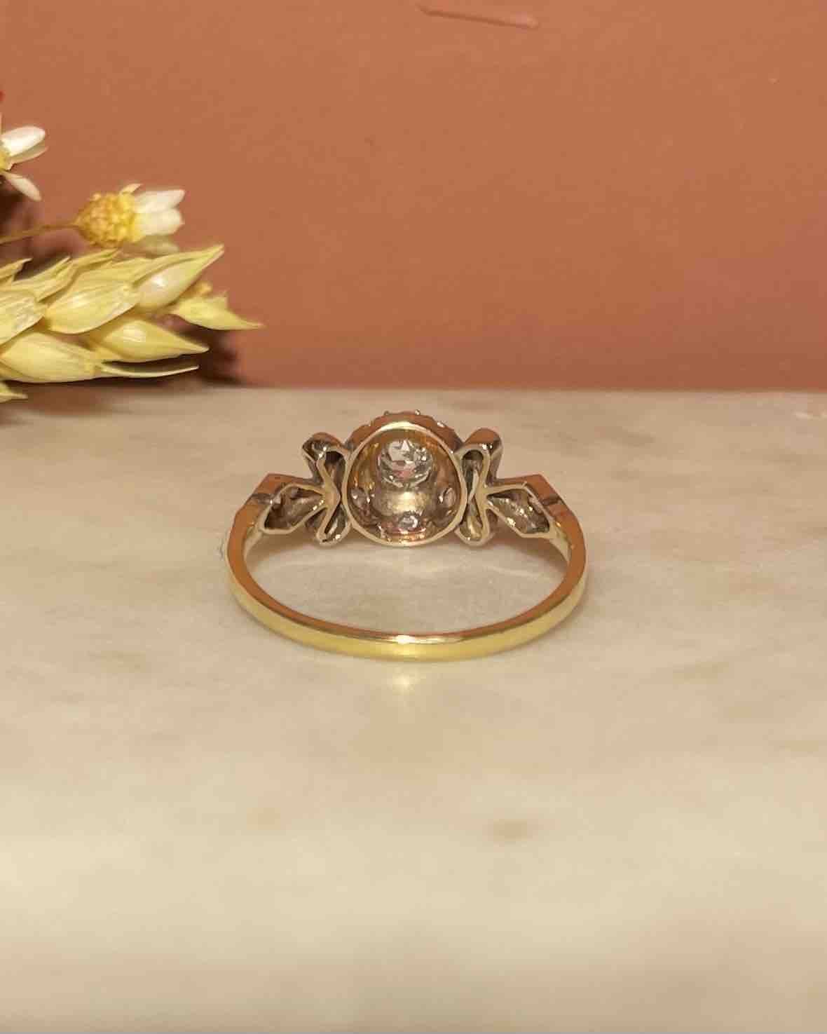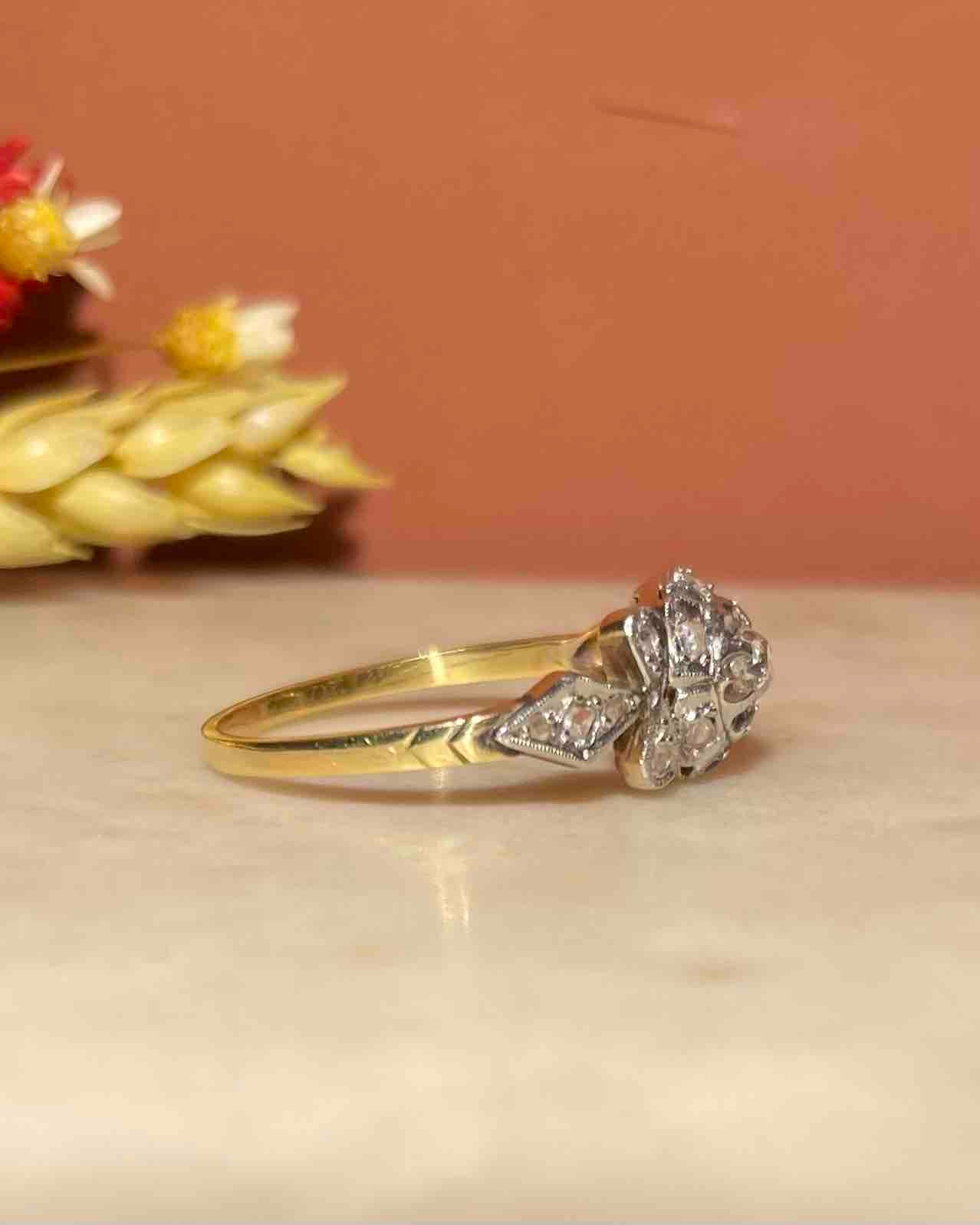 Cette création ancienne est centrée d’un diamant taille rose de 0.10 carat entouré de seize diamants taille rose, disposés de manière symétrique, créant un jeu de lumière captivant.