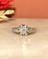 Ce travail en or gris 18 carats est serti d’un diamant central de 0.35 carat. Les attaches du corps de bague sont pavées de cinq diamants taille ancienne.