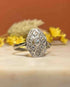 Cette bague est ornée d’un diamant central éblouissant dans un entourage de vingt diamants.