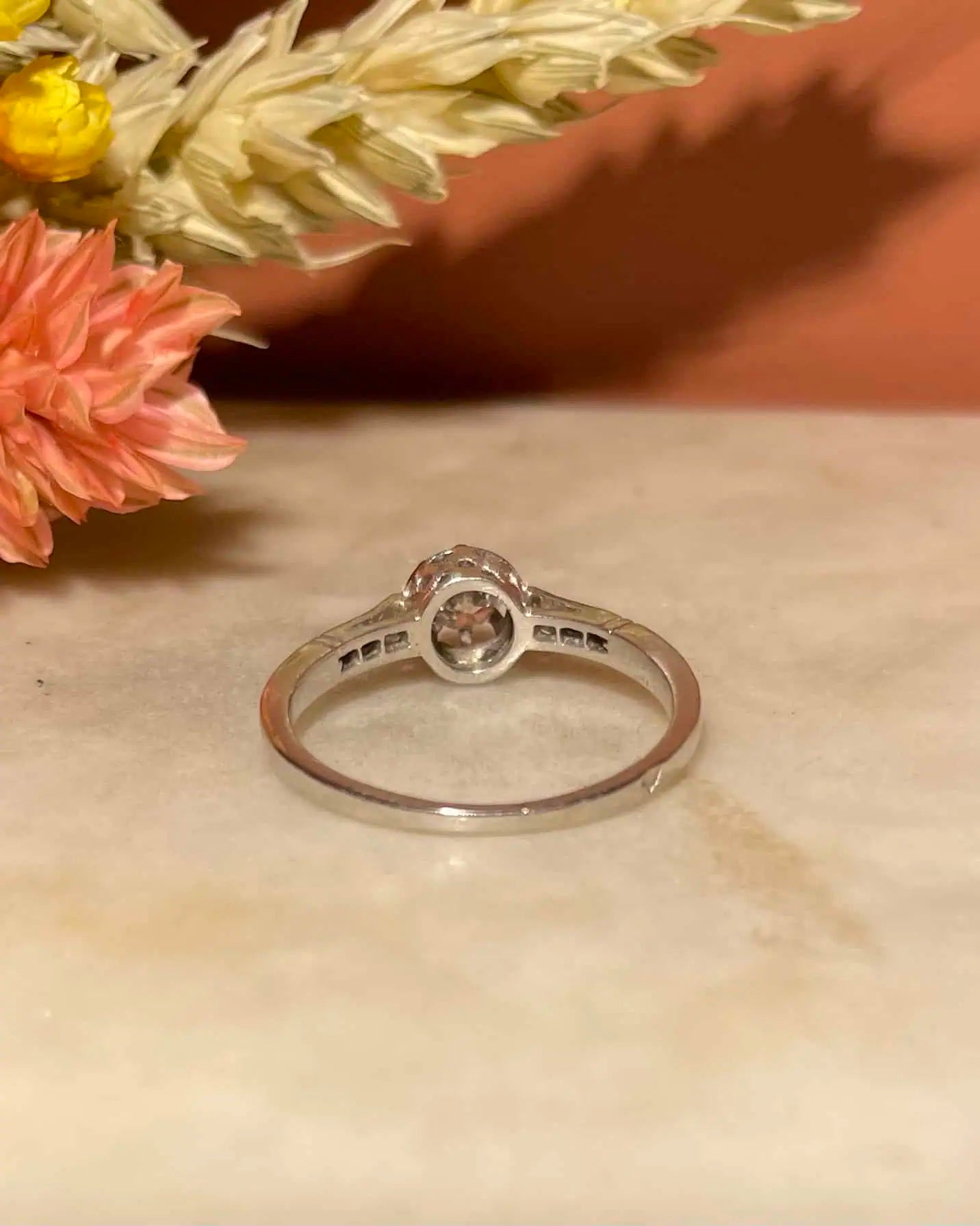« Freja » est une sublime Bague solitaire art-déco vintage des années 1930, délicatement façonnée en or gris 18 carats et en platine.
