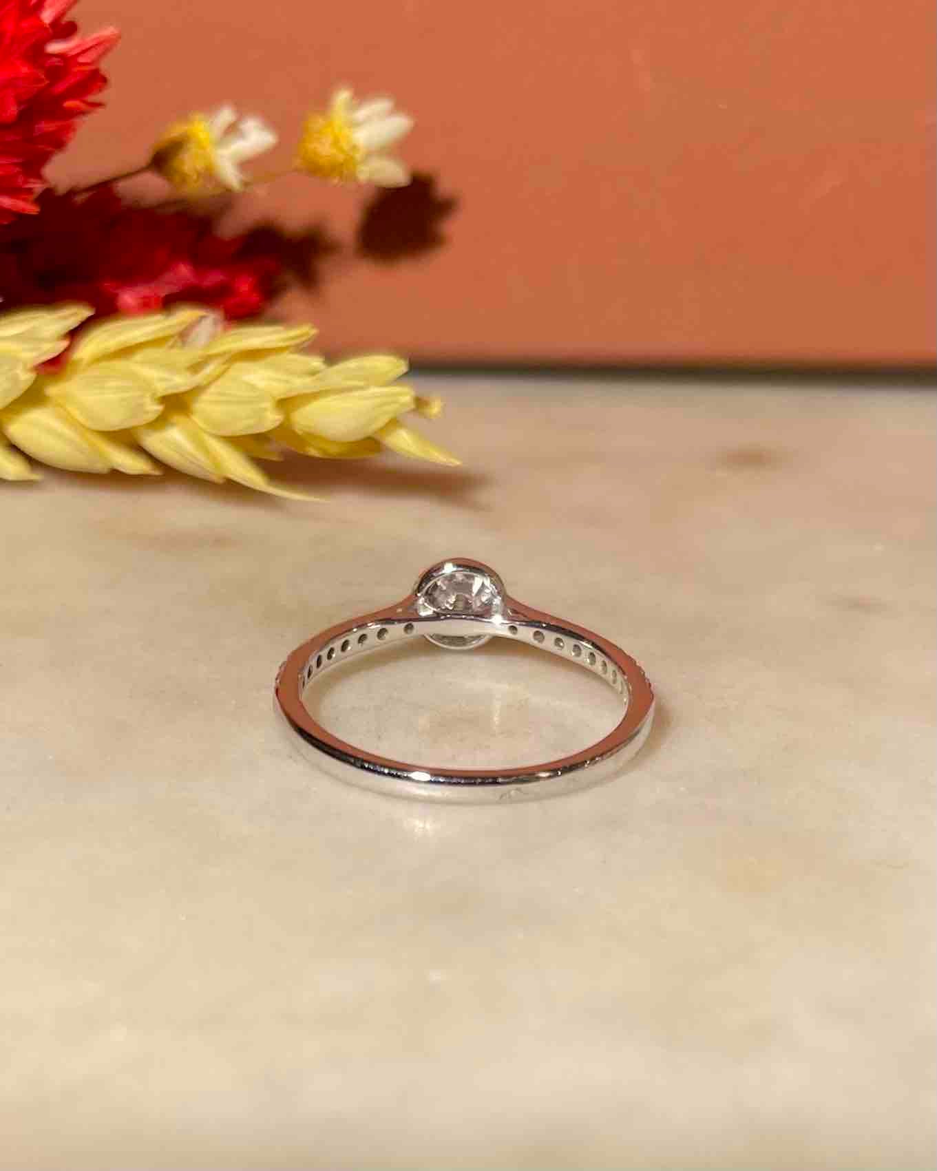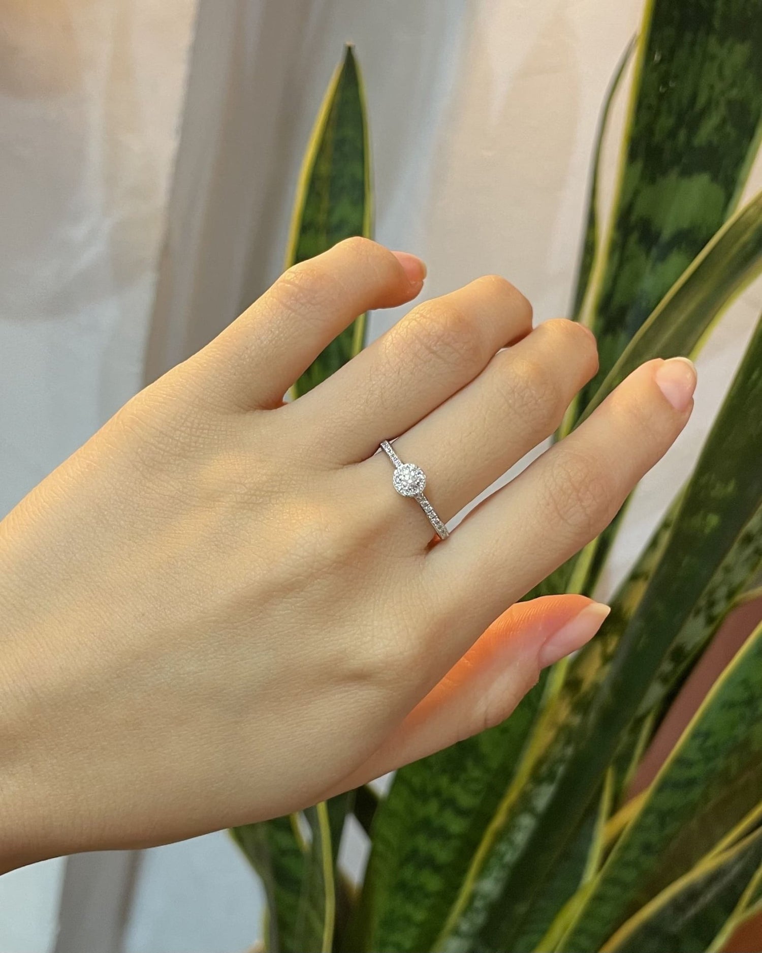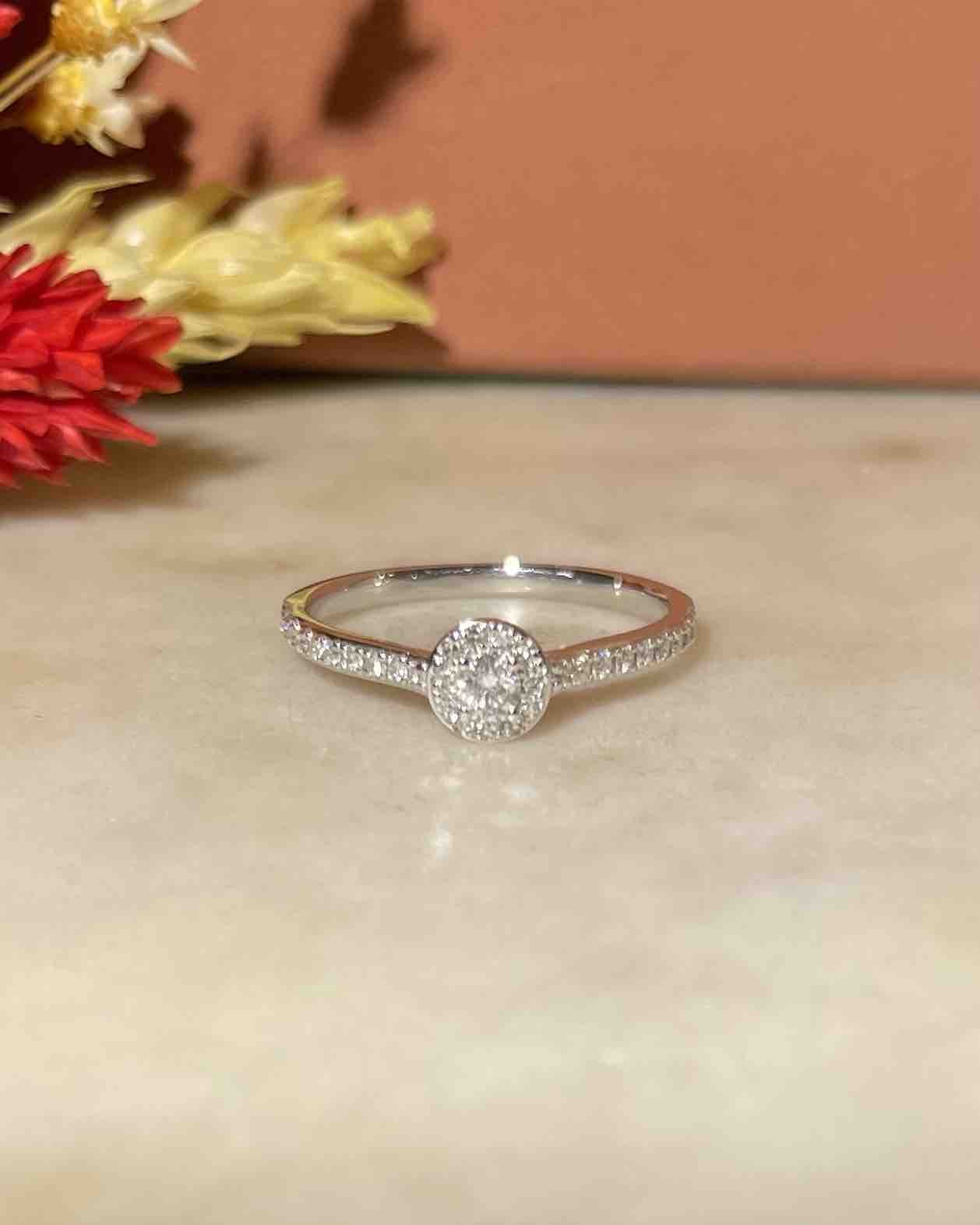 Elle met en valeur un diamant central brillant de 0.07 carat. Entourée d’une aura magique composée de 32 diamants. son, anneau est délicatement ajouré par d’éblouissants diamants de part et d’autre.