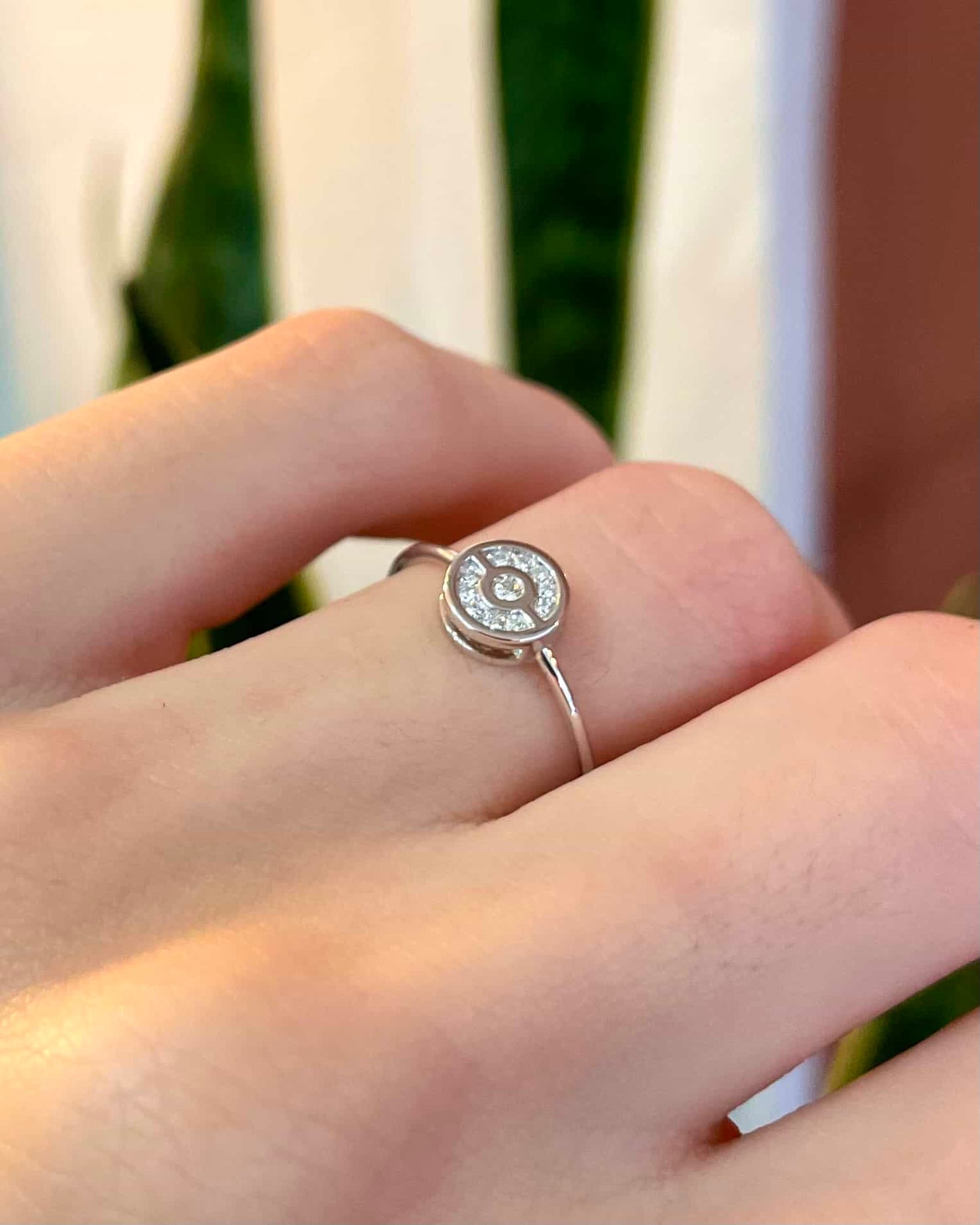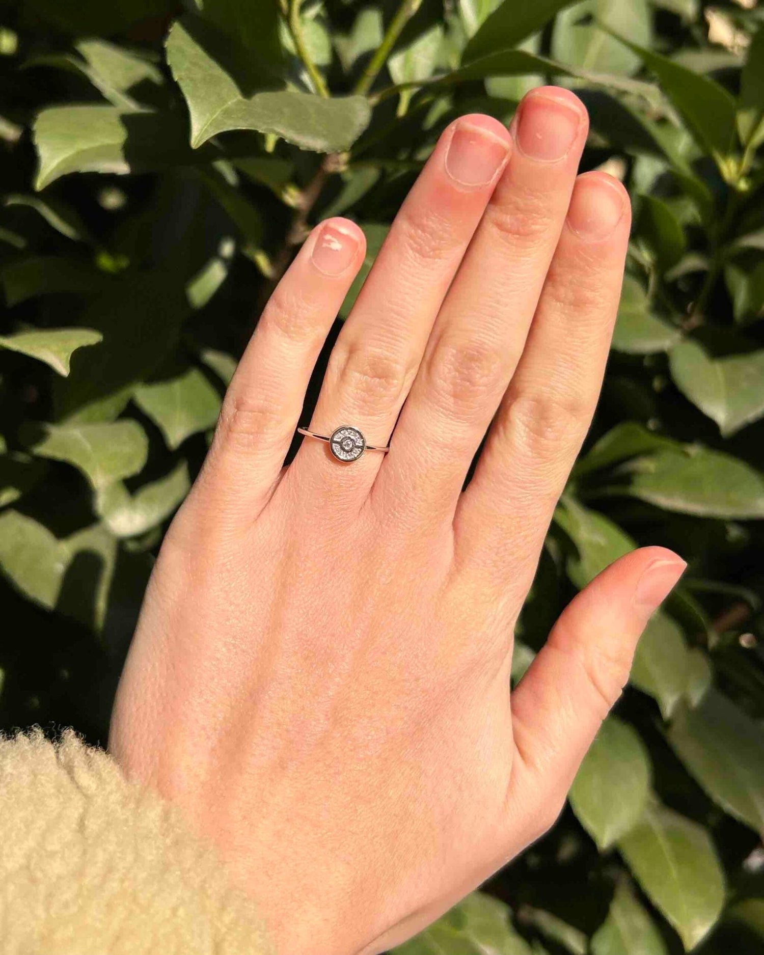 Au cœur de la bague, un sublime diamant central de 0.02 carat. Entouré par un délicat halo de dix autres diamants ronds brillant.