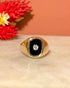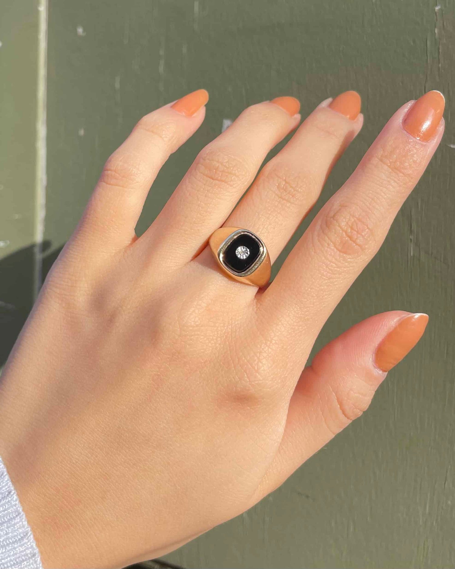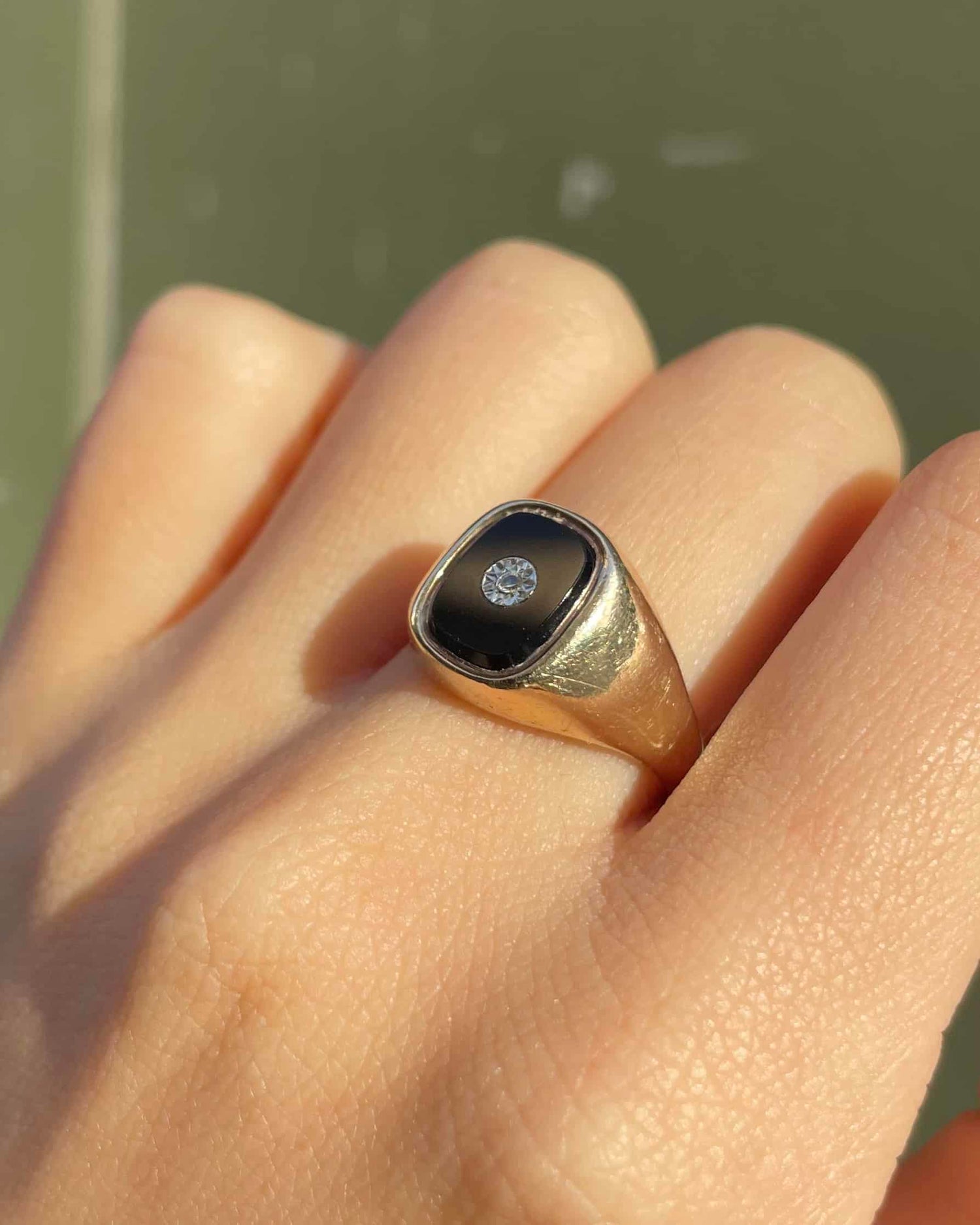 Son plateau est habillé d’une plaque d’onyx, qui done du caratcère à la bague. Elle est sertie d’un diamants scintillant au centre pour relever la lumière de la bague.