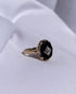 Une plaque d’onyx retient un diamant étincelant de lumière.
