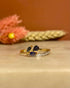 Son anneau gracieux, ajouré en or jaune et gris 18 carats, retient trois éblouissant saphirs de 0.34 carat au total carat, et un diamant brillant de 0.01 carat.