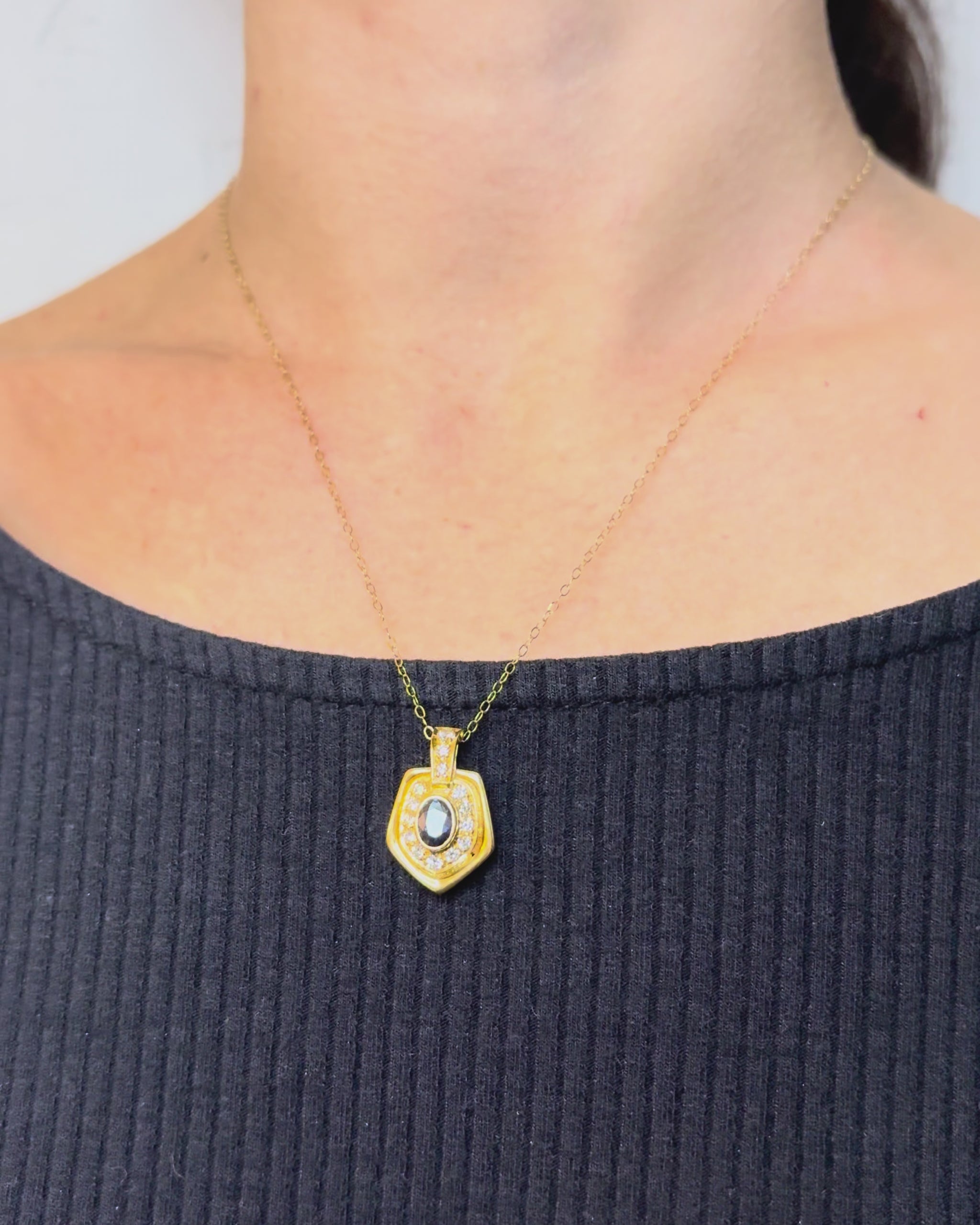 "Mireille" est un magnifique pendentif style Art Déco vintage, façonné en or jaune 18 carats. Son design géométrique est le reflet d'une époque qui a marqué la joaillerie pour son style révolutionnaire. Il met en valeur un sublime saphir de 1 carat, au bleu vibrant et profond. Il est épaulé de 14 diamants, totalisant 0.47 carat, qui apportent encore plus d'éclat et d'élégance à ce pendentif ancien.