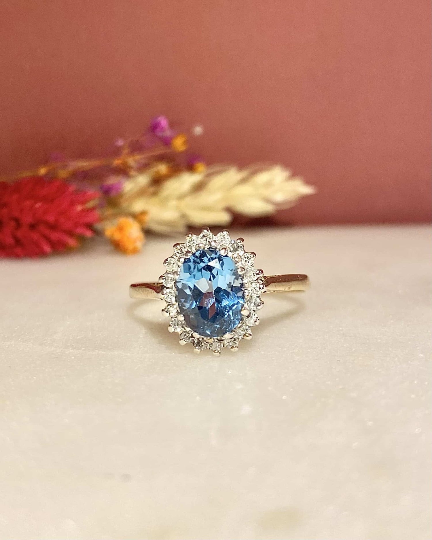 Elle met en valeur une topaze de 1.40 carat aux reflets bleu clair uniques, sublimée par un entourage de vingt diamants étincelants totalisant 0.20 carat, formant un halo lumineux d’une rare intensité.