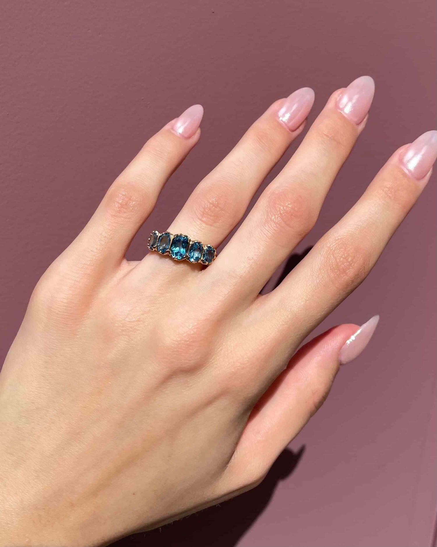 Ce délicat travail met en lumière cinq éblouissante Topazes bleues, pour 3.50 carats au total.