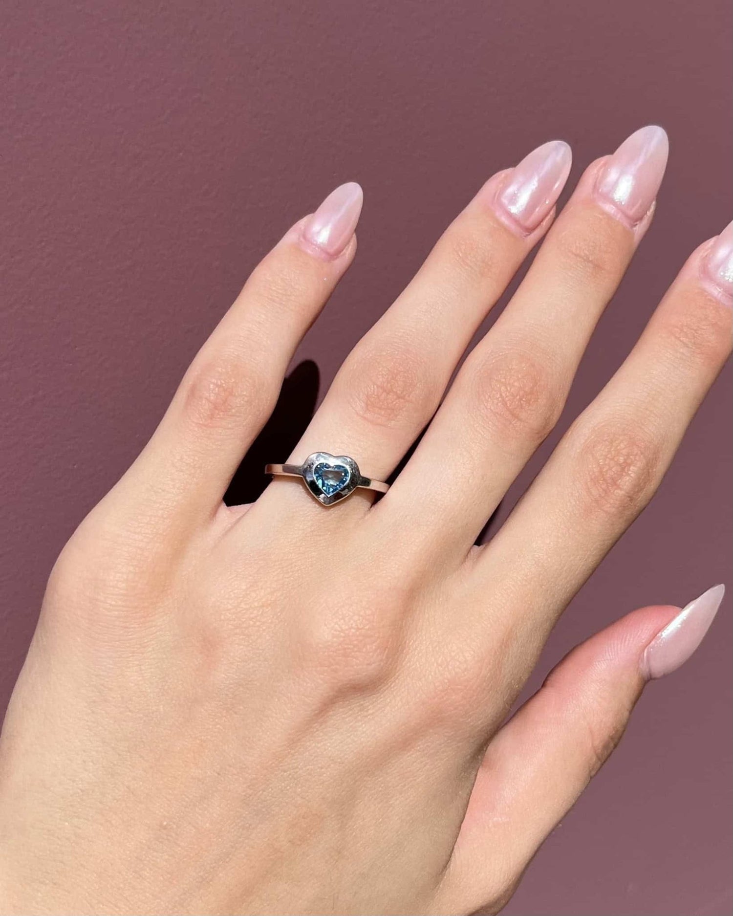 Cette magnifique création retient une magnifique topaze bleue lumineuse de 0.50 carat en forme de coeur aux reflets cristallins somptueux.