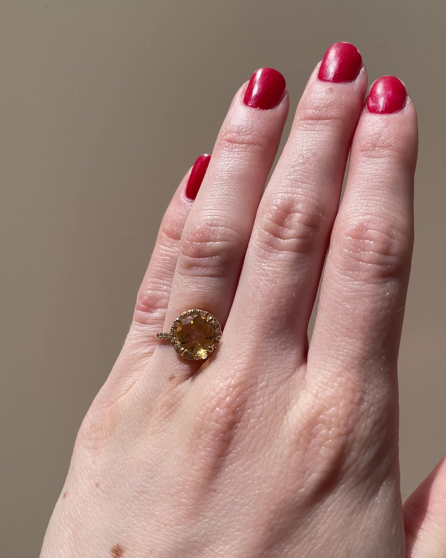 Façonnée en or jaune 18 carats, elle est ornée d’une citrine de 1.37 carat, sublimée par 26 diamants totalisant 0.13 carat.