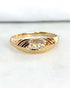 "Ema" est une sublime bague jonc vintage, façonnée en or jaune 18 carats dans les années 1970. Son délicat travail de l'or, à la fois raffiné et singulier, révèle un artisanat français d'une grande finesse. Cette bague ancienne est sertie de 3 diamants totalisant 0.06 carat, qui lui apportent éclat et élégance intemporelle.