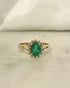 La bague "Paula" est une création captivante alliant l'élégance du style marguerite à la beauté emblématique de l'émeraude. Façonnée en or jaune 14 carats, ce bijou vintage déploie toute sa splendeur.