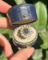 Elle est habillée d’un merveilleux saphir d’un un carat aux sublimes reflets dans un entourage de douze diamants.