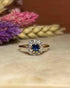 Elle est habillée d’un majestueux saphir bleu roi de 0.60 carat aux sublimes reflets. Il est entouré de neuf pétales de diamants taille ancienne, pour un total de 0.40 carat, créant un splendide halo lumineux.