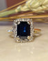 Elle est sertie d’un merveilleux saphir de 2.30 carats et est entourée de dix diamants lumineux, d’un total de 0.12 carat.