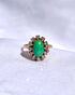 La pierre est entourée de douze diamants en marguerite et montée sur de l’or rose.