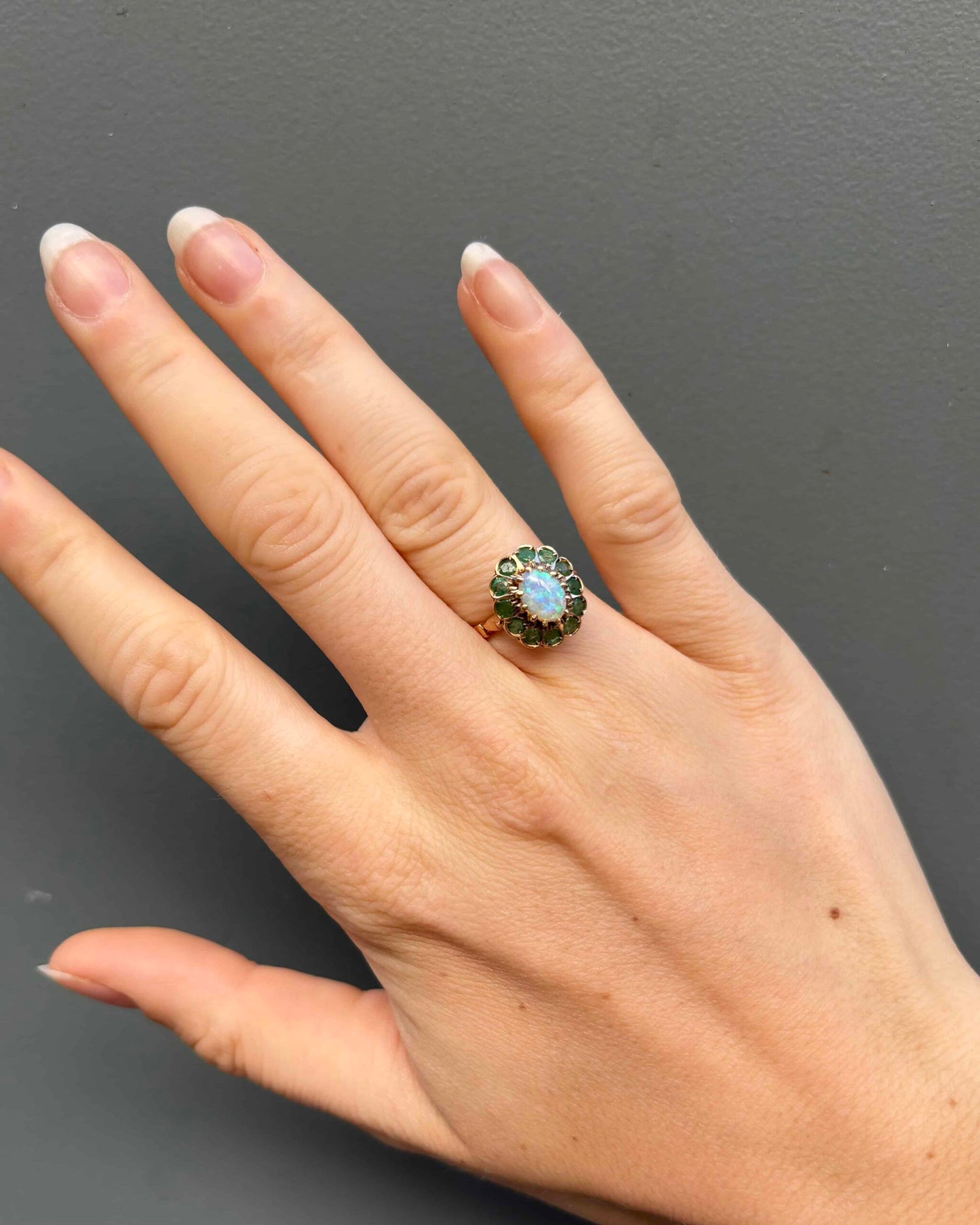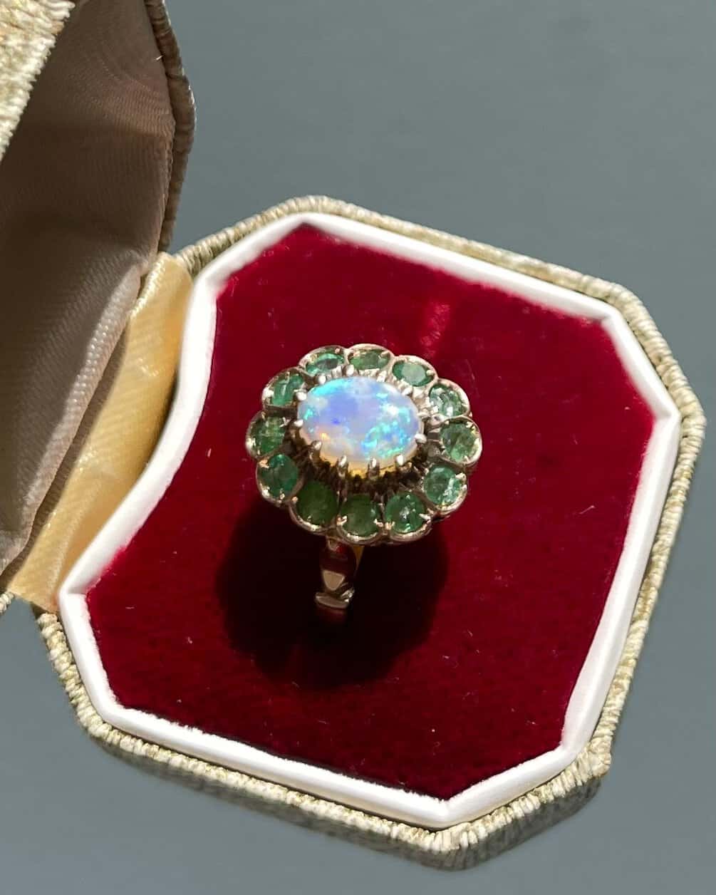 Ce bijou allie la beauté envoûtante de l’opale et l’éclat subtil des émeraudes, créant un ensemble à la fois poétique et raffiné.