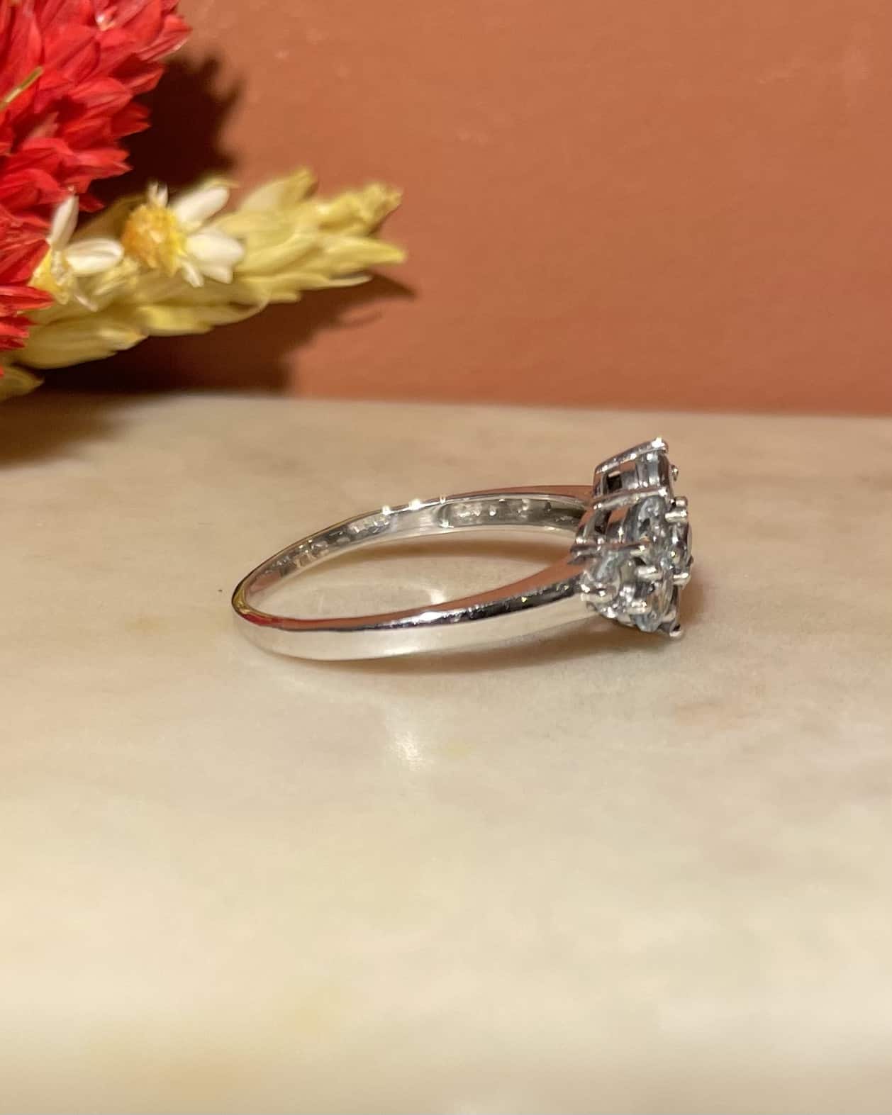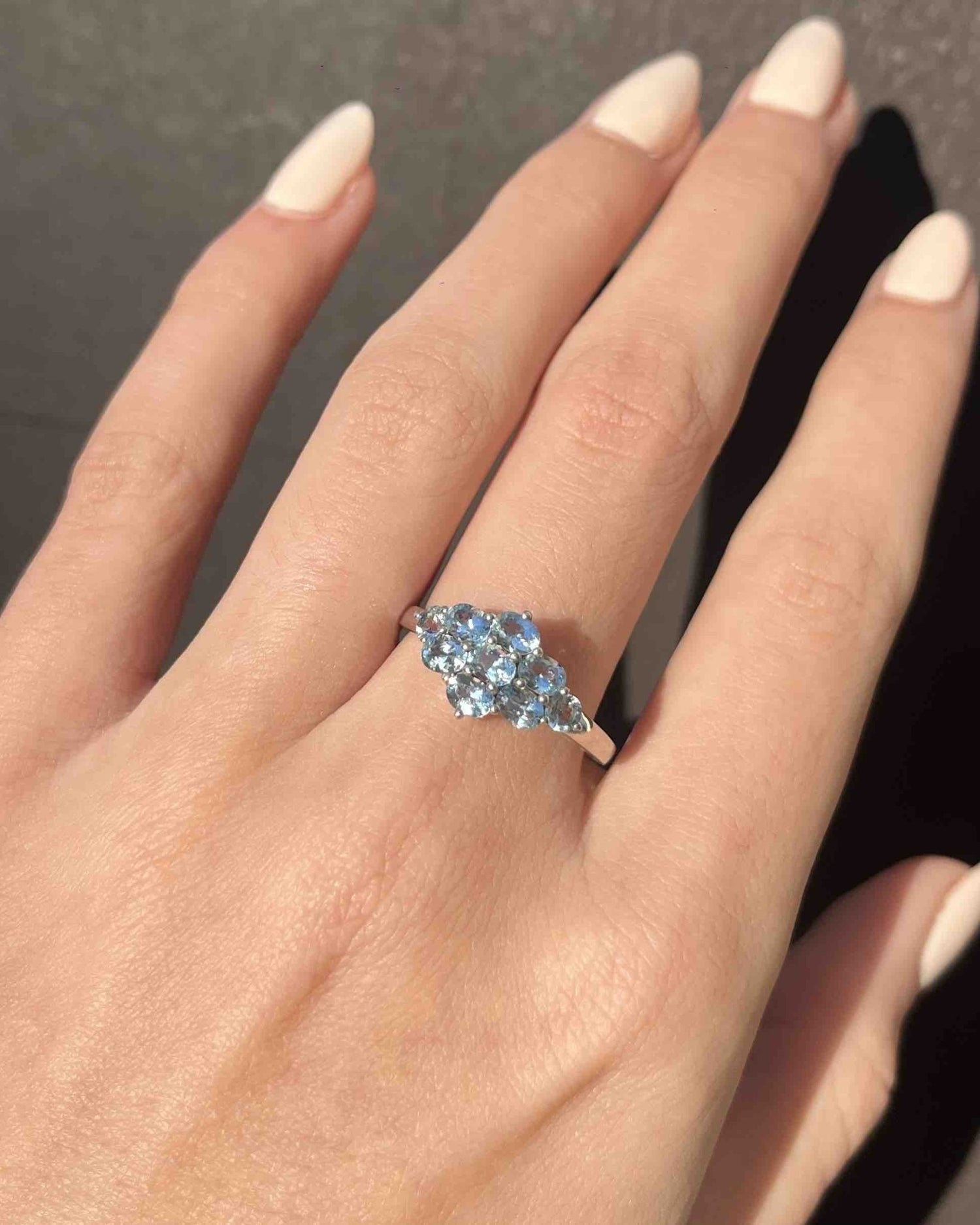 Cette création vintage est sertie de huit aigues-marines, formant un losange élégant et lumineux qui allonge et sublime la forme du doigt, pour un total 1.25 carat.
