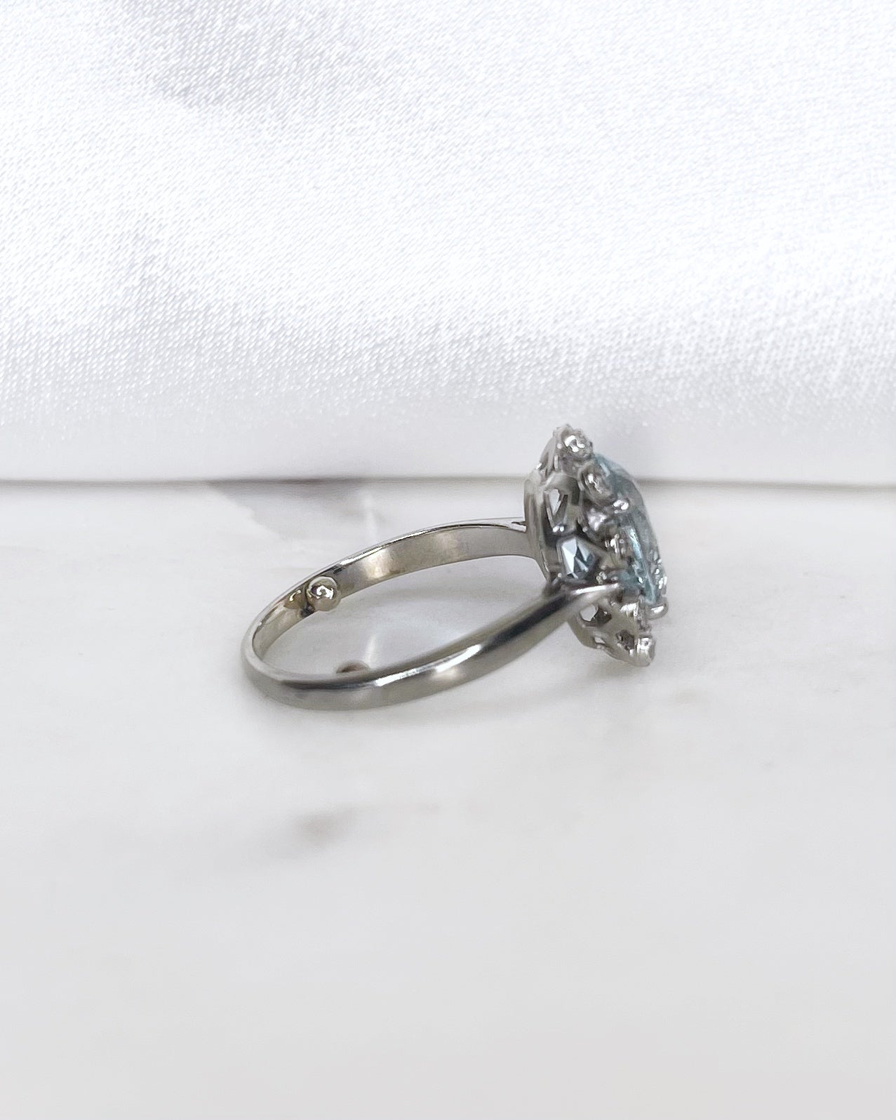 La bague "Inaya" est une sublime création vintage au style marguerite, façonnée en or gris 18 carats. Elle met en valeur une magnifique aigue-marine centrale de 2.30 carats, entourée de 10 diamants étincelants totalisant 0.10 carat.
