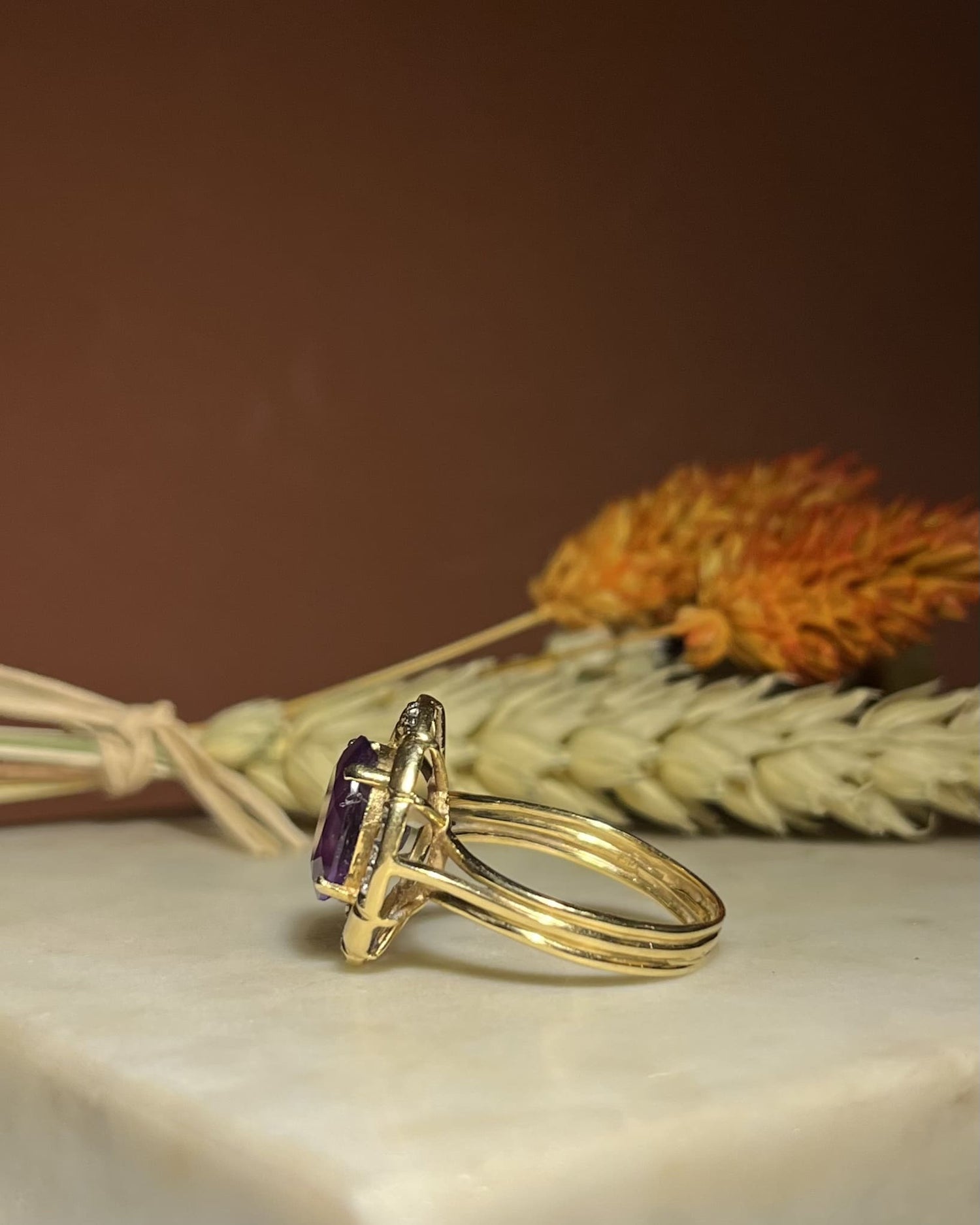 Sa monture ancienne est sertie d’une améthyste éblouissante de 4 carats.