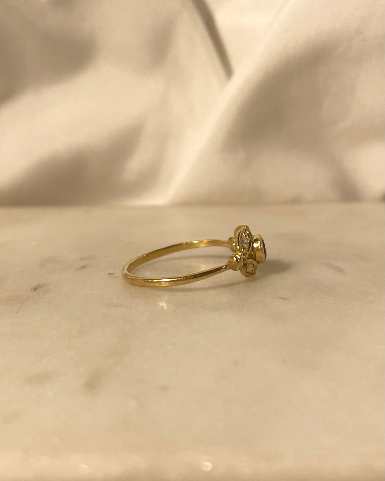 “Livie” est une sublime bague Solitaire en Jonc habillée en son centre d’une améthyste lumineuse de 0.60 carat.