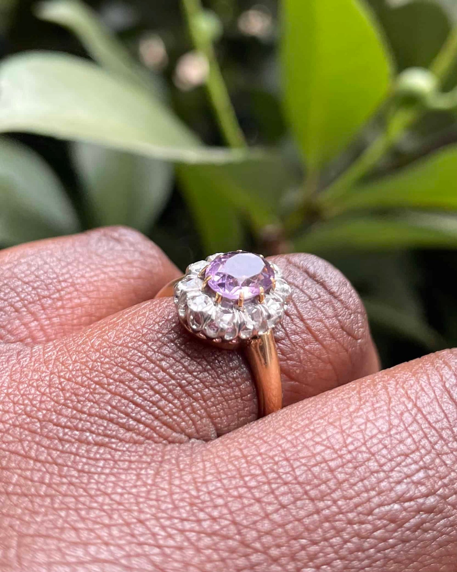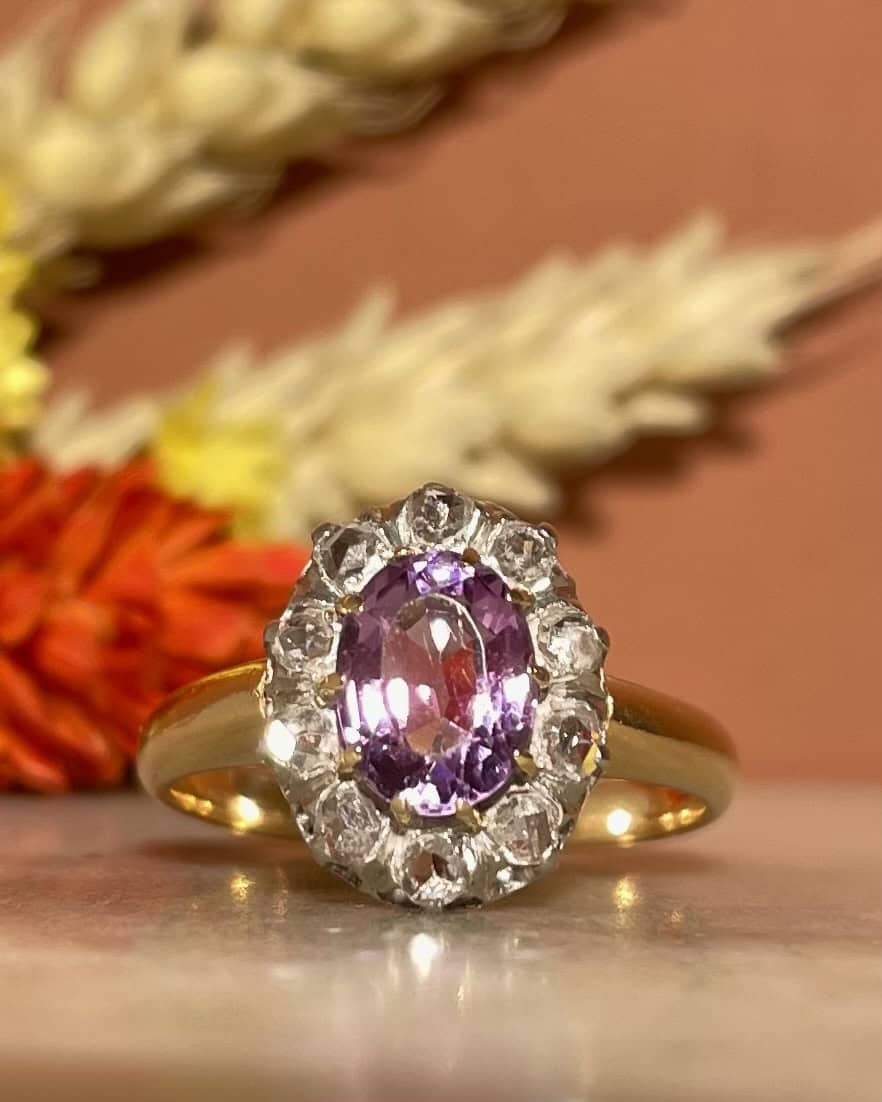 Cette envoûtante bague est rehaussée de dix diamants taille rose de 0.40 lumineux. L’Améthyste pierre aux reflets magnétiques est la pierre de la créativité.