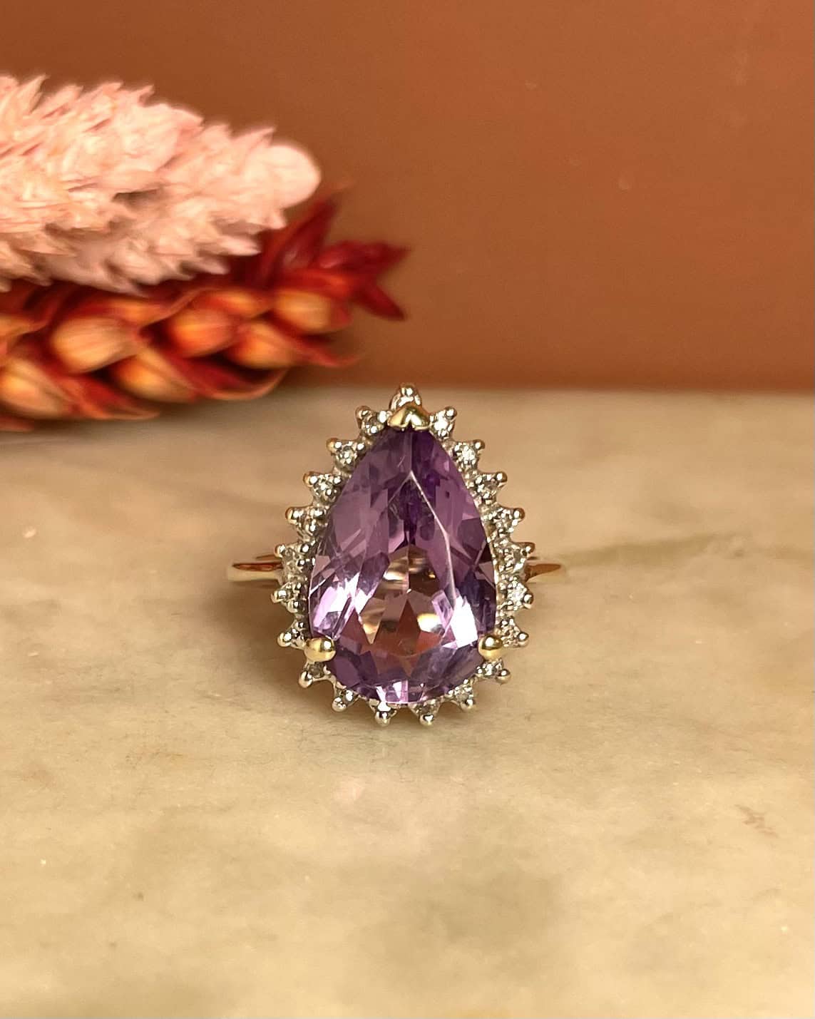 Cette envoûtante bague est rehaussée de vingt-et-un diamants lumineux pour un total de 0.21 carat. L’Améthyste pierre aux reflets magnétiques est la pierre de la créativité.