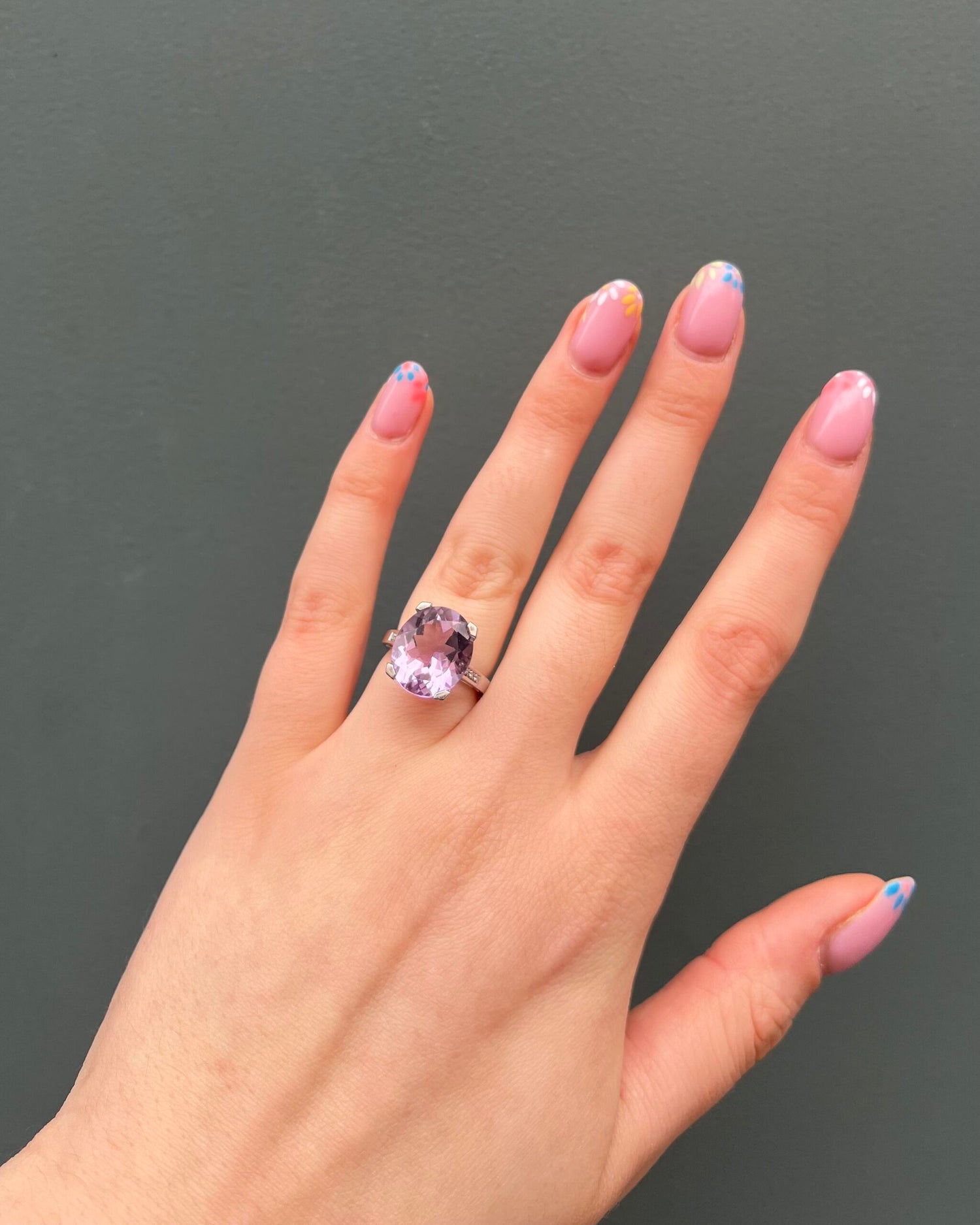 Au centre trône une somptueuse Améthyste de 6.90 carats montée sur un anneau façonné à la main en or gris 18 carats.