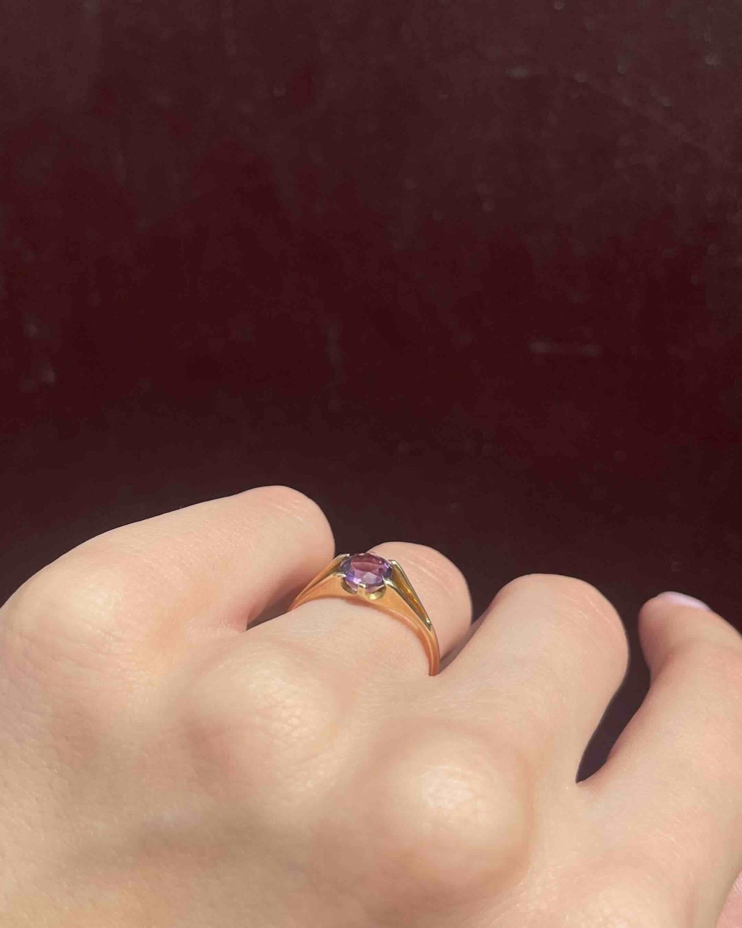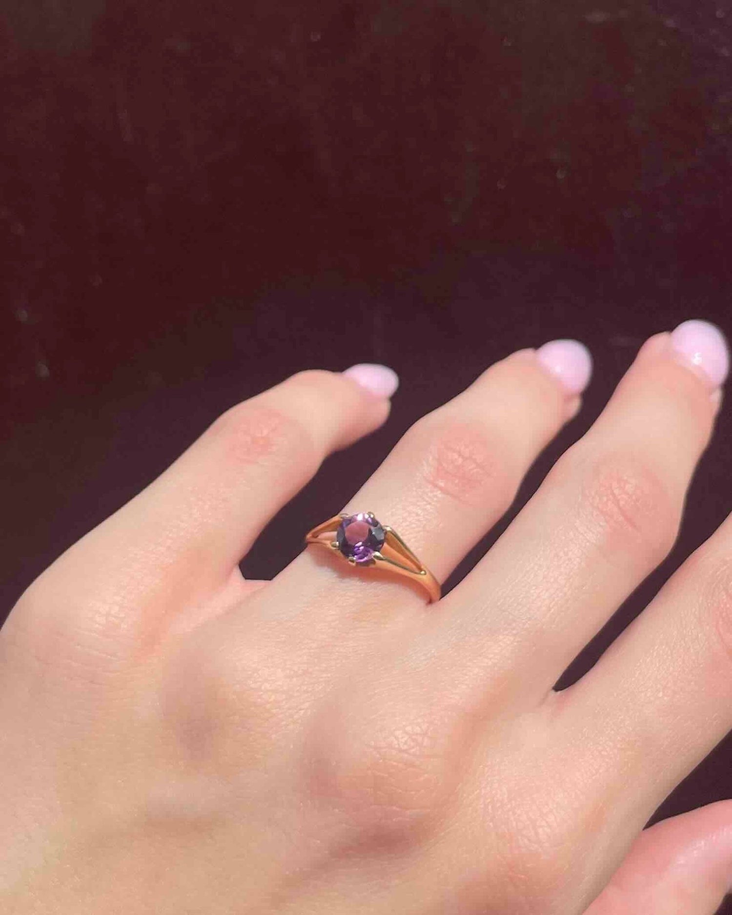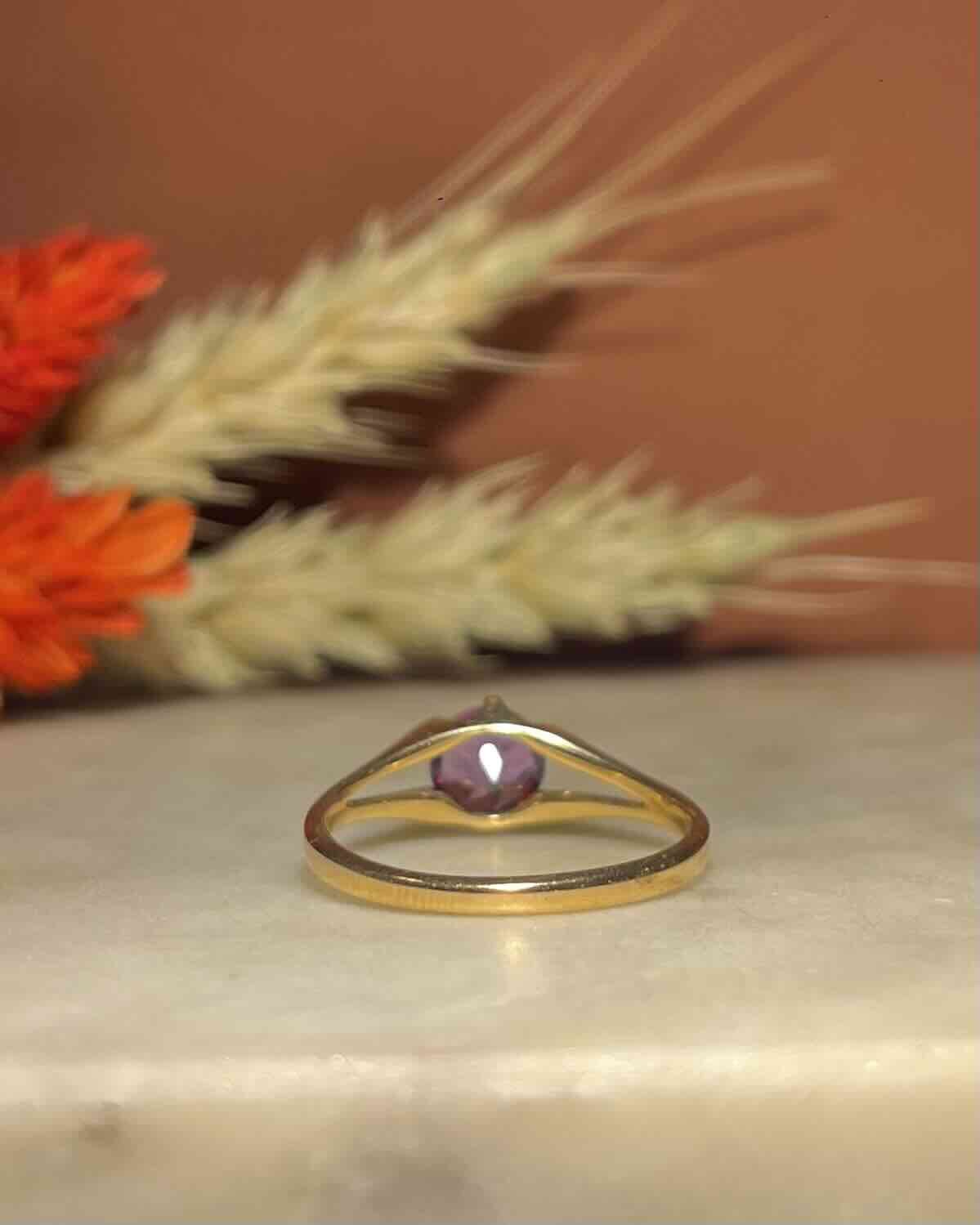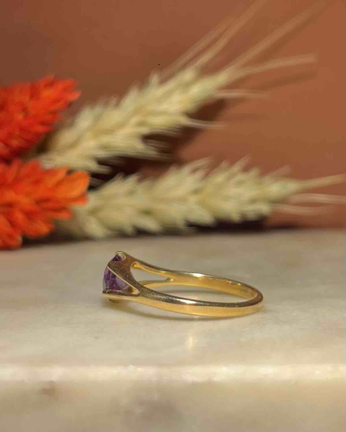 « Dakota » est une magnifique bague solitaire des années 1970, sublimée par une améthyste lumineuse de 0.75 carat.