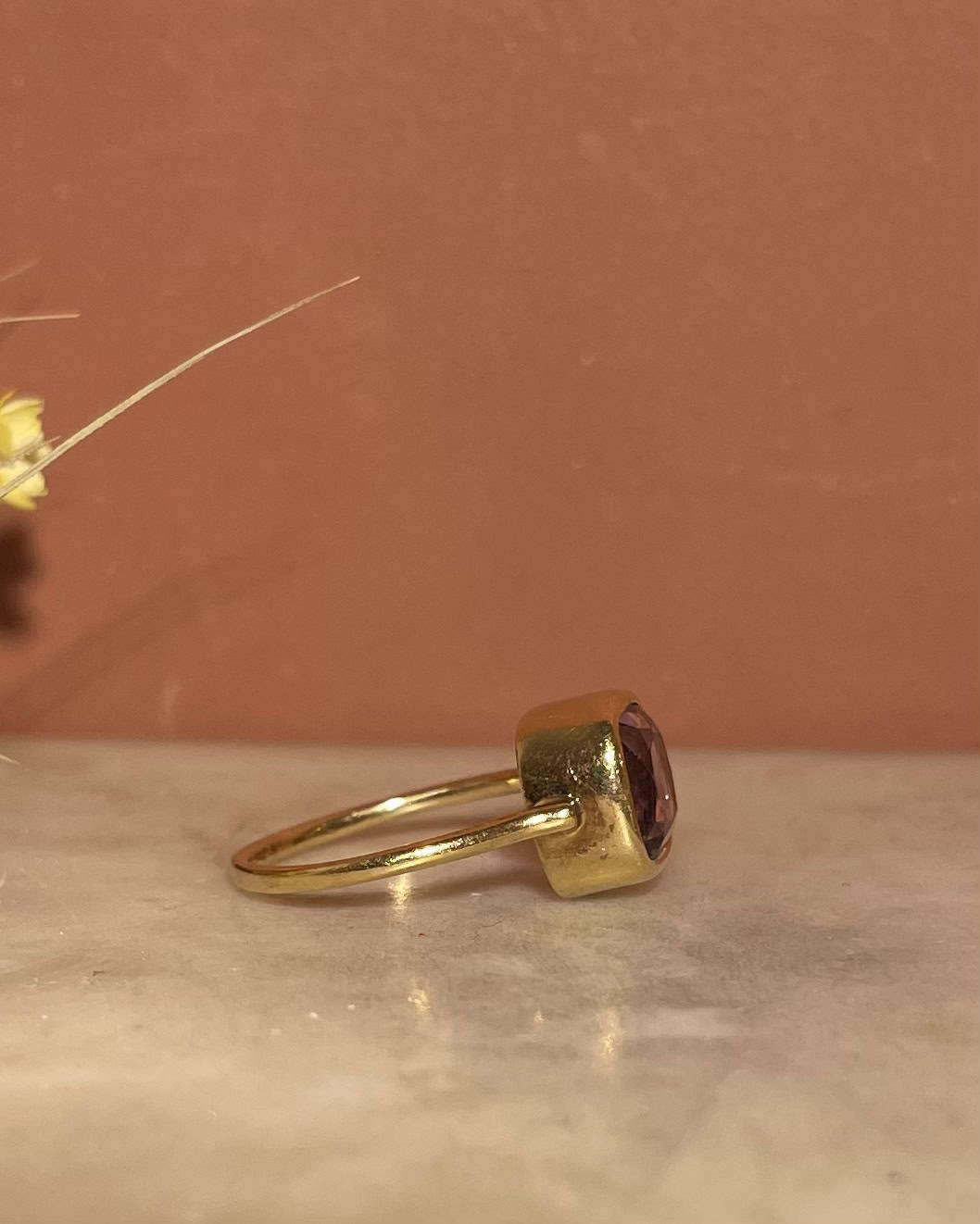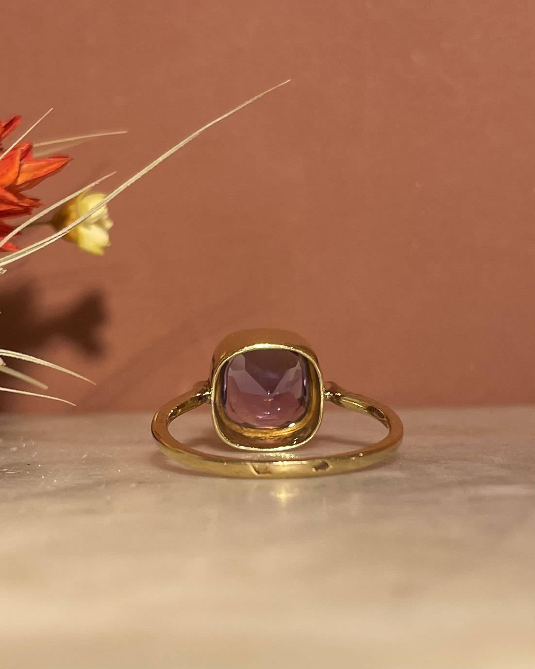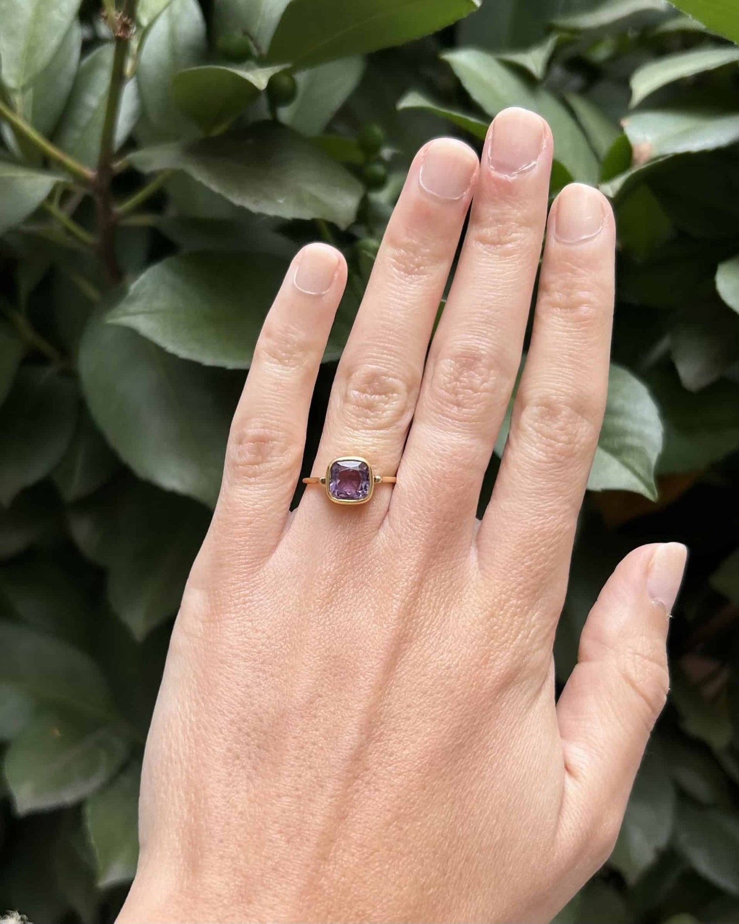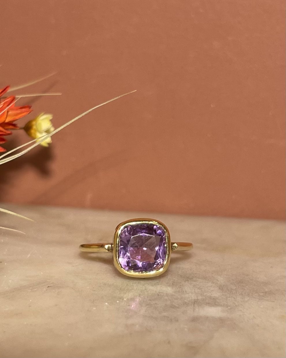 « Hezia » est une magnifique bague solitaire au style vintage, inspirée des années 1980, sublimée par une améthyste lumineuse de 1.90 carat.