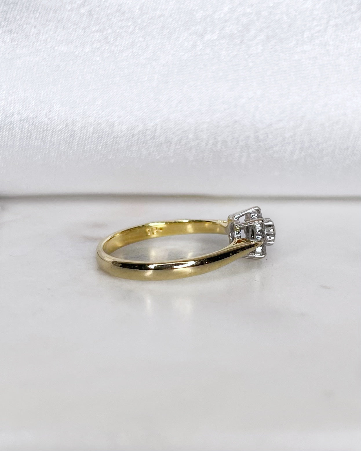 La bague "Myloryn" est une création Marguerite raffinée, façonnée en or jaune et or gris 18 carats. Elle met en lumière un diamant central de 0.09 carat, sublimé par un entourage de huit diamants totalisant 0.16 carat. Une pièce lumineuse au charme vintage, idéale pour marquer les instants précieux.