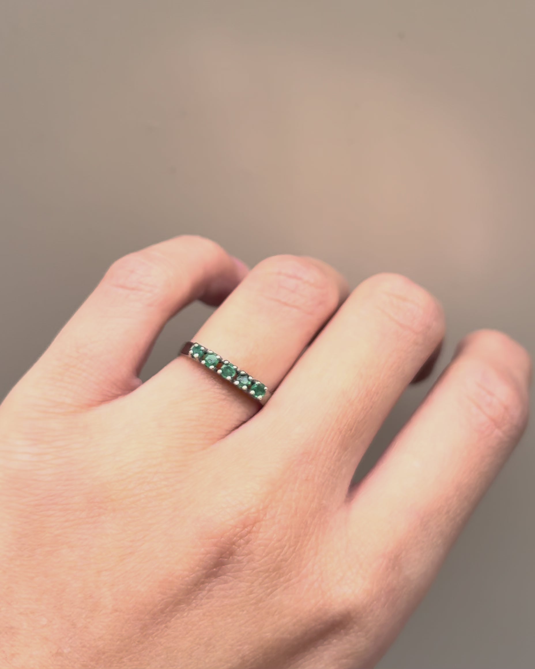 "Georgia" is a stunning half-eternity ring, handcrafted in 14-carat white gold. It features 5 emeralds totaling 0.15 carats, set with prongs.