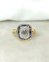 "Noémie" est une bague style Art Déco vintage, confectionnée dans les années 1980 en or jaune 18 carats. Son design géométrique de caractère et très convoité met en valeur un travail joaillier d'exception. En son cœur trône un beau saphir de 0.15 carat au bleu intense et vibrant. Il est épaulé d'un halo de 19 saphirs totalisant 0.40 carat, et 2 diamants totalisant 0.02 carat, qui apportent encore plus d'éclat à cette bague ancienne.