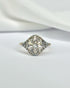 "Paloma" est une sublime bague Art Déco vintage, en or jaune 14 carats et platine. Confectionnée dans les années 1920, son design géométrique et son motif central finement ciselé incarnent avec finesse l'audace et le savoir-faire de l'époque. Elle est sertie de 9 diamants taille rose de 0.07 carat au total, qui lui confère un éclat magique.